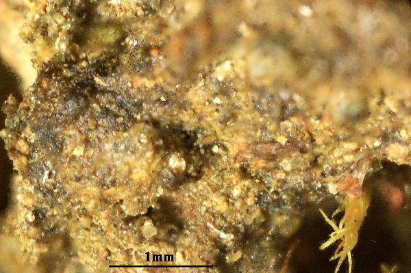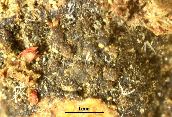 Aphanopsis coenosa. Pale apothecia on a thallus of minute goniocysts. Photo taken in the field. Sävsjö, Södra industriområdet, 17 Feb. 2020. Bar = 1 mm.