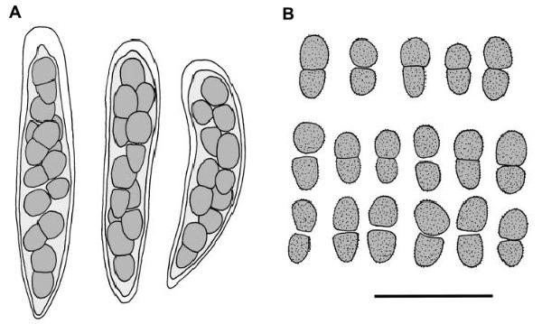 Italy Abrothallus teloschistis, holotypus. A – asci; B – ascospores. Scale bar = 20 μm.