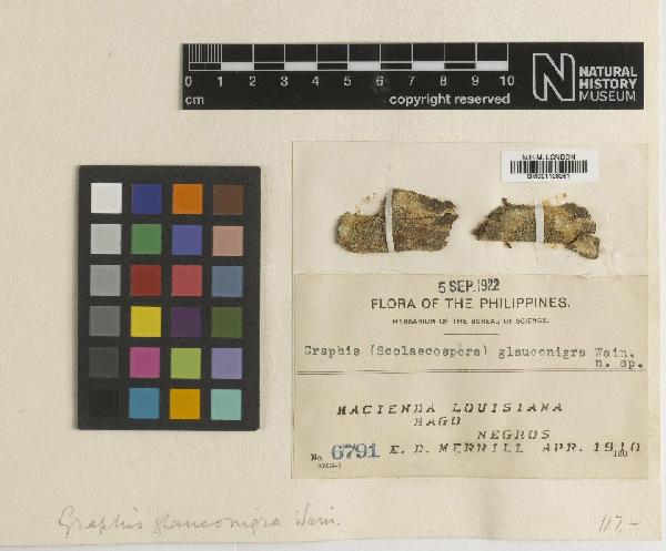 As Graphis glauconigra Vain. - 1910 - The Trustees of the Natural History Museum, London, United Kingdom - CC BY.