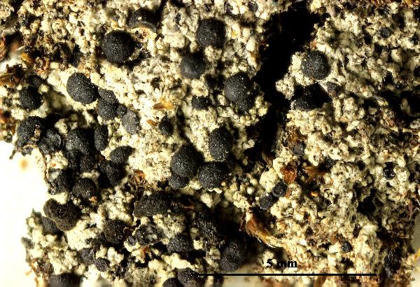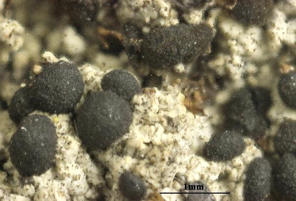 Description: Thallus crustose, episubstratic, continuous to granulose-verrucose, white to grey-white, without a distinct prothallus. Cortex with calcium oxalate crystals: medulla white, I-. Apothecia lecideine, black, to 0.3-1.2(-1.5) mm across, immersed to sessile, with a flat to convex, rarely pruinose disc and a thin, finally often excluded proper margin. Proper exciple brown-black throughout, with rounded, thin-walled cells, the pigment giving a K+ yellow solution; epithecium brown, N-; hymenium colourless, not inspersed with oil droplets, 70-85(-100) µm high, I+ blue; paraphyses branched in upper part, the apical cell swollen, 4-5 µm wide, with a brown cap; hypothecium brown-black. Asci 8-spored, clavate to cylindrical-clavate, the apical dome K/I+ dark blue with a pale, conical-pointed apical cushion (axial mass), the wall I-, but the thin outer gel I+ blue, Bacidia-type. Ascospores 3-septate, dark brown, often curved, narrowly ellipsoid, (20-)24-38(-43) x 6-13 µm, the wall uniformly thick, indistinctly rugulate. Pycnidia rare, black, immersed in thallus. Conidia bacilliform, 4-6 x c. 1 µm. Photobiont chlorococcoid. Spot tests: thallus K- or K+ indistinctly yellow, C-, but C+ intensely yellow under the dissecting microscope, KC+ yellow to orange-yellow, P-, UV+ orange. Chemistry: 6-O-methylarthothelin.