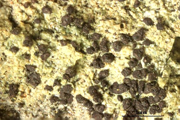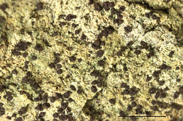 Description: Thallus crustose, episubstratic, dark reddish brown, areolate, the areoles contiguous, angular, 0.2-0.5(-0.9) mm wide, the peripheral ones slightly elongate, up to 1.1 mm long, forming small, subplacodioid, up to 1 cm wide rosettes, without a distinct pro- or hypothallus. In section the thallus is homoiomerous and pseudoparenchymatous throughout, often overlain by a thin epinecral layer, 130-140 mm thick, the hyphae with more or less isodiametrical, 5-8 mm wide cells. Apothecia pycnoascocarps (developing from pycnidia), lecanorine-aspicilioid, 0.1-0.3 mm across, at first punctiform, then with an expanded disc, immersed in the areoles (usually 1 per areole) with a dark reddish brown, sometimes marginally slightly pruinose disc, and a very thin, finally often excluded thalline margin. Proper exciple poorly developed; epithecium pale reddish brown, K+ blue-purple, K/I+ blue; hymenium colourless, 40-50 mm high, K/I+ blue; paraphyses strongly moniliform, branched in upper part, the apical cells not swollen; hypothecium colourless, opaque, 40-45 mm thick. Asci 8-spored, subglobose, unitunicate-rostrate, the wall composed of an outer, non-expansible and an inner, expansible layer surrounding the protoplast as an amyloid collar, which expands during spore release into a long, tapering rostrum, the outer wall layer strongly amyloid. Ascospores 1-celled, hyaline, narrowly ellipsoid, reniform, allantoid to lunate, rarely shortly sigmoid, twisted in the asci, (8-)9.5-15(-17) x (3-)3.5–6(–6.5) μm. Photobiont chlorococcoid. Spot tests: thallus K+ blue-purple, C-, KC-, P-, UV-, I+ reddish. Chemistry: without lichen substances.Note: on steeply inclined surfaces of siliceous rocks with periodical water seepage after rain, both in the Mediterranean Region and in dry-warm Alpine valleys; perhaps overlooked, but certainly not common.