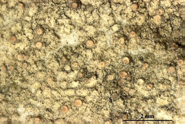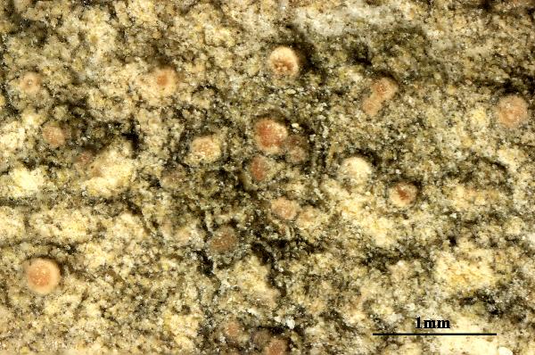 Description: Thallus crustose, endosubstratic, continuous to finely rimose, pinkish orange, yellowish, brownish or grey, without a distinct prothallus. Apothecia immersed in the thallus and often separated by a circular crack, 0.2-0.7 mm across, rounded or irregular in outline, with an initially concave, then flat, pink to pale brown disc, and a rather evident, whitish margin. Proper exciple thin, poorly developed; epithecium colourless, K-, N-; hymenium colourless, (75-)100-120(-140) µm high; paraphyses simple or sparingly branched, submoniliform in upper part, the apical cells slightly swollen; hypothecium colourless. Asci 8-spored, cylindrical-clavate, the outer coat I+ blue, but the inner walls and apical dome K/I-. Ascospores 1-celled, hyaline, ellipsoid, 13-22 x 5-12 µm. Pycnidia immersed, pale, the wall colourless, N-. Conidia bacilliform. Photobiont trentepohlioid, the cells 10-18 µm wide. Spot tests: thallus K-, C-, KC-, P-, UV-. Chemistry: without lichen substances.Note: an arctic-alpine to cool-temperate, circumpolar species found on hard, compact calciferous rocks, such as limestone, dolomite, calcareous schists, in sheltered-humid situations; most frequent in the Alps, but reaching south to Calabria along the Apennines.