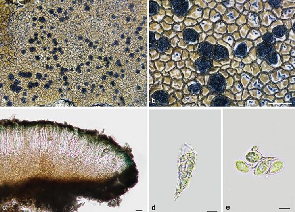 Immersaria athroocarpa (a–e SDNU20190227): a–b thallus c apothecial anatomy d ascus e ascospores. Scale bars: 1 mm (a–b); 20 μm (c); 10 μm (e).
