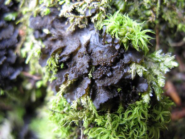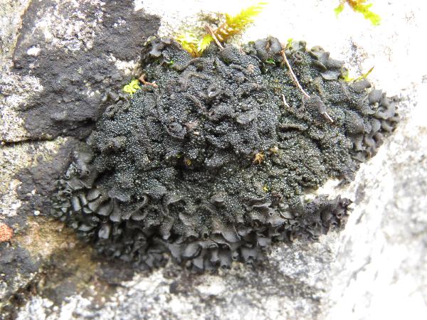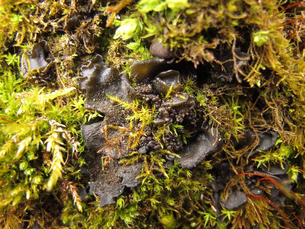 Description: Thallus foliose, broad-lobed, homoiomerous, markedly gelatinous and swollen when wet, 3-10 cm in diam, the lobes to 1 cm wide, ear-like, c. 0.15 mm thick when dry, 0.3-0.5 mm thick when wet, brown-black to dark olive-green, the surface finely striated (when dry), covered in crowded, globose to clavate isidia-like outgrowths (0.2-0.8 mm diam. when wet). Lower surface paler, with scattered to confluent, whitish hapters. Upper and lower cortices absent. Apothecia rare, lecanorine, 2-3 mm across, with a brown-red, concave to flat disc and an often pseudoisidiate thalline margin. Thalline exciple ecorticate; proper exciple euparaplectenchymatous; epithecium brownish; hymenium colourless, up to 140 µm high; paraphyses simple or sparingly branched in upper part, 2-3 µm thick at mid-level, the apical cells up to 5 µm wide; hypothecium pale yellow. Asci 8-spored, cylindrical-clavate, the apex strongly thickened, the apical dome K/I+ pale blue, with a downwardly projecting K/I+ deep blue tubular structure. Ascospores submuriform with 3-4(-5) transverse septa and 1(-2) longitudinal septa, ellipsoid to ovoid, (19-)25-36 x 8-13 µm. Pycnidia rare, mostly marginal, paler than thallus. Conidia simple, bacilliform, 4-5 x 1-2 µm. Photobiont cyanobacterial (Nostoc, the cells in long chains). Spot tests: all negative. Chemistry: without lichen substances. Note: a temperate to southern boreal-montane, holarctic lichen found on calcicolous mosses, rarely directly on rock in sheltered situations, e.g. in woodlands or on shaded walls; usually absent above treeline and rare within settlements and in areas with intensive agriculture.