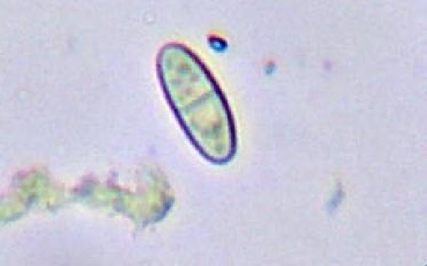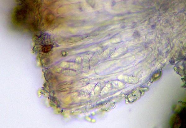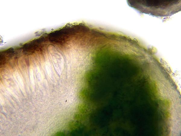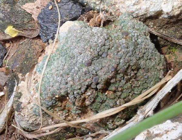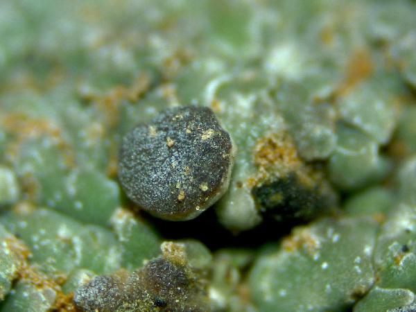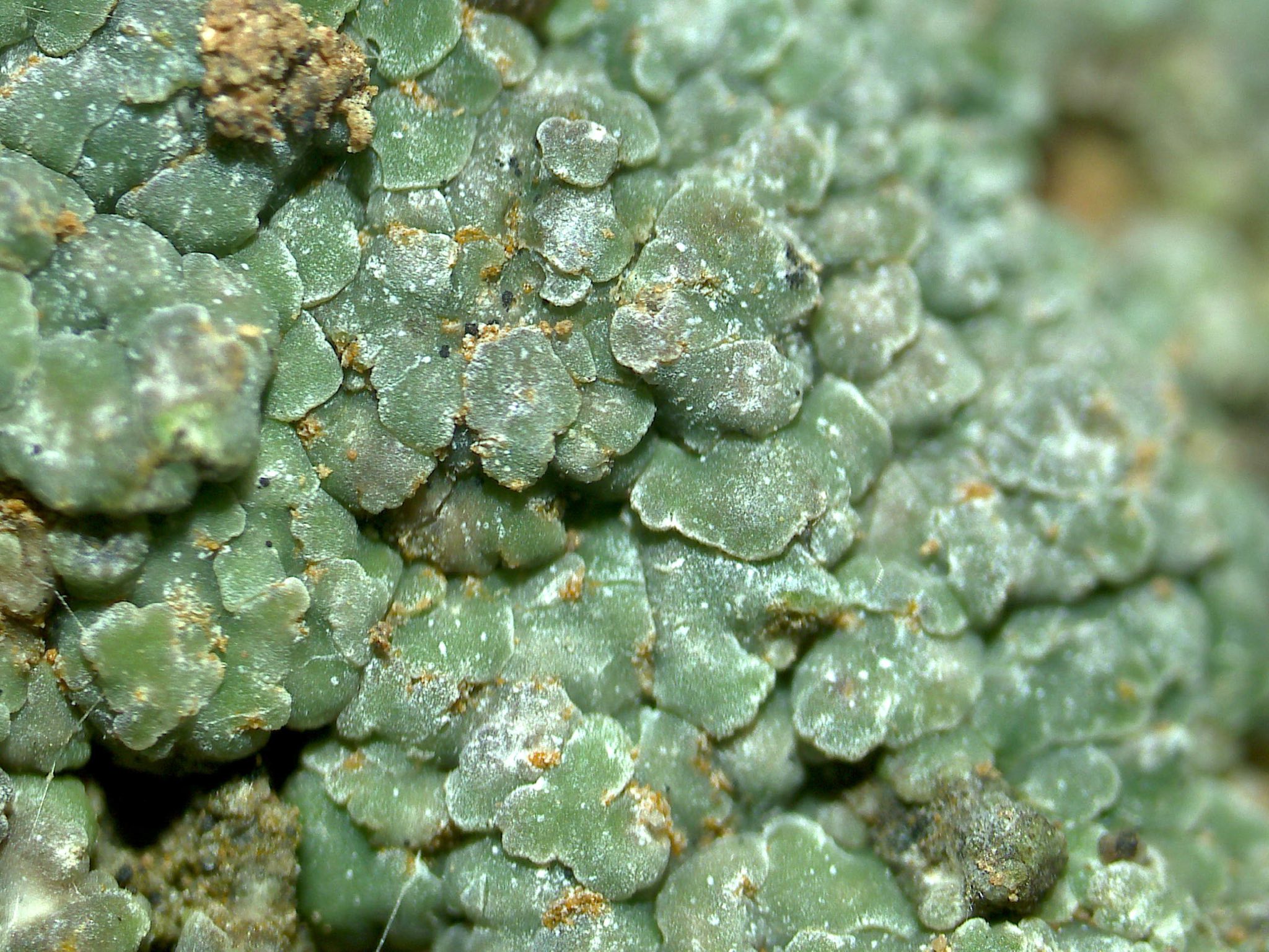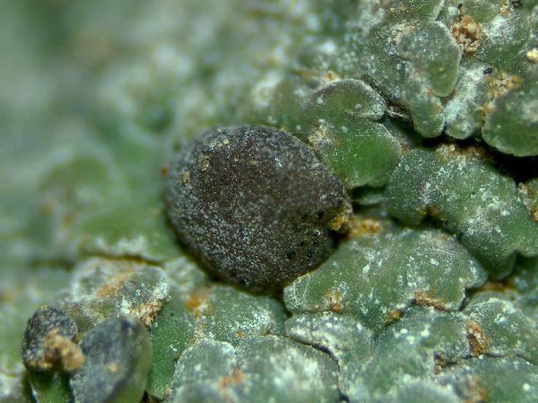 Description: Thallus crustose-subplacodioid, episubstratic, up to 300 µm thick, areolate-warted, pale to dark brown, often white-pruinose, especially in sun-forms, the areoles contiguous, usually convex, (0.5-)1-2 mm wide, the marginal ones subsquamulose, elongated and more or less clearly radiating. Cortex paraplectenchymatous, brown in upper part, sometimes with an epinecral layer; algal layer well-distinct; medulla white, thick, I-. Apothecia lecanorine, 0.7-1.8 mm across, with a brown to brown-black, usually white-pruinose, flat to slightly convex disc and a usually paler, sometimes finally excluded thalline margin. Thalline exciple corticate, with an epinecral layer, rich in algal cells; proper exciple thin, colourless to pale brown in upper part; epithecium orange-brown to reddish brown, with a colourless epipsamma, K- or K+ purple-red; hymenium colourless to patchily orange-brown, (40-)50-80 µm high, K/I+ blue; paraphyses simple or sparingly branched, 1.5-2 µm thick at mid-level, the apical cells only slightly swollen, some of them with a brown cap; hypothecium colourless to pale brown. Asci 8-spored, cylindrical to narrowly clavate, with a K/I+ blue tholus and a central non-amyloid area, Bacidia-type. Ascospores 1(-2)-septate, hyaline, ellipsoid, straight or slightly curved, thin-walled, (8-)10-14(-16) x (3-)4-6 µm, without a gelatinous perispore. Pycnidia black, immersed. Conidia thread-like, straight or slightly curved, up to 20 µm long. Photobiont chlorococcoid. Spot tests: thallus K-, P-, KC-, P-, UV-. Chemistry: without lichen substances.Note: a mainly Mediterranean lichen found on inclined surfaces of compact calciferous rocks at relatively low elevations, especially common on walls in villages; mainly Tyrrhenian in Italy.