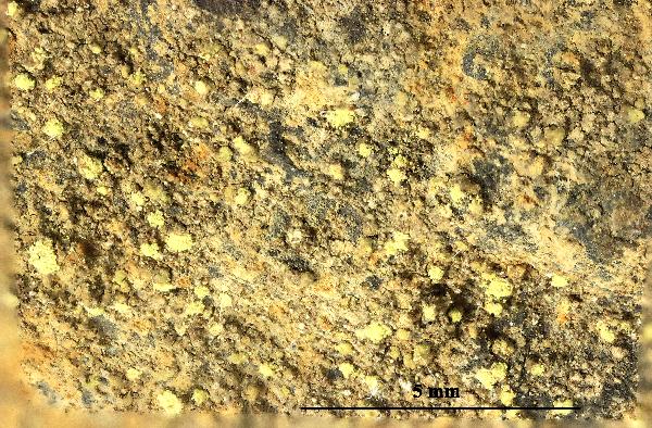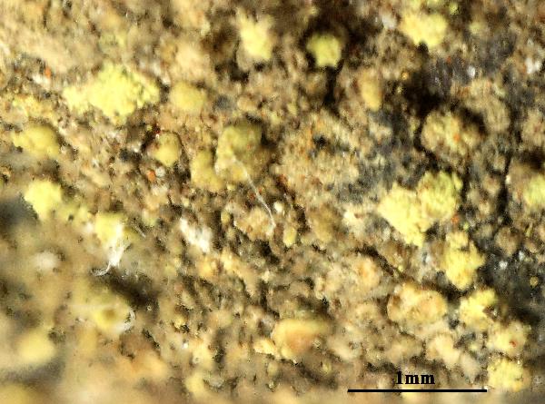 Description: Thallus crustose, episubstratic, of flattened to usually strongly convex-verrucose, aggregated or dispersed, yellow to greenish-yellow, sometimes darker bottle-green areoles, rarely delimited by a thin black prothallus, the areoles more or less covered with pale green to lemon-yellow soredia arranged in globose, convex, finally confluent soralia arising in the center. Apothecia rare, lecanorine, sessile, 0.5-2 mm across, with a concave to slightly convex, brownish yellow disc and a flexuose, sometimes sorediate, concolorous thalline margin. Epithecium yellowish to brownish, with yellowish granules insoluble in K; hymenium colourless, 65-85 µm high; paraphyses branched and anastomosing, 1-2 µm thick at mid-level, the apical cells not or only slightly swollen; hypothecium colourless. Asci 8-spored, clavate, Lecanora-type. Ascospores 1-celled, hyaline, broadly ellipsoid, 8-13 x 5-6.5 µm. Photobiont chlorococcoid. Spot tests: K-, C-, KC-, P-, UV+ bright orange. Chemistry: epanorin, rhizocarpic acid, zeorin.Note: a holarctic early coloniser of steeply inclined to rain-sheltered surfaces of metal-rich metamorphic rocks, mostly found in upland areas; probably restricted to the Alps in Italy.
