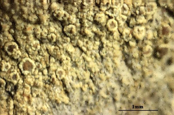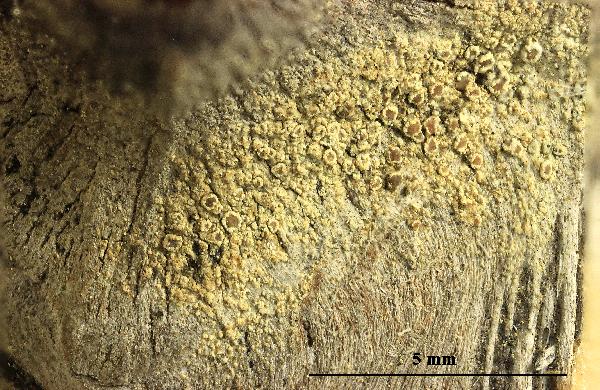 Description: Thallus crustose, usually endosubstratic in non-sorediate parts, episubstratic in sorediate parts, thin, yellowish green, at first forming small, up to 1-2 cm wide orbicular patches which later become confluent and may cover extensive areas, often delimited by a whitish to bluish grey prothallus. Fertile specimens sometimes with esorediate, slightly convex, to 0.2 mm wide, ecorticate areoles; sorediate specimens with diffuse, farinose (20-50 µm in diam.), yellowish green soredia which finally cover almost the whole thallus, giving it a subleprose appearance. Apothecia rare, lecanorine, up to 1(-1.5) mm across, with a dull yellow to pale brown, sometimes pruinose, flat to slightly convex disc and a weakly prominent, often persistent, sorediate thalline margin. Thalline exciple of irregularly entangled hyphae; proper exciple colourless, 20-35 µm wide laterally; epithecium pale yellow, with numerous small yellowish crystals soluble in K; hymenium colourless, 30-60 µm high; paraphyses simple to sparingly branched and anastomosing, 1.5-2.5 µm thick at mid-level, the apical cells slightly thicker; hypothecium colourless to pale yellow, up to 100 µm high. Asci 8-spored, clavate, very thin-walled, with a K/I+ blue, tall tholus penetrated by a faintly amyloid apical cushion, the wall K/I-, surrounded by a blue outer layer, Lecanora-type. Ascospores 1-celled, hyaline, ellipsoid to broadly ellipsoid, (7.5-)9-14(-17) x (3-)4.5-6(-7.5) µm. Photobiont chlorococcoid. Spot tests: thallus and soredia K+ pale yellow, C+ deep yellow to orange, KC+ weakly orange or K-, P-; UV+ brownish orange (long wave) or UV+ dull violet (short wave), K/UV+ mint-green turning golden yellow when dry. Chemistry: usnic acid, zeorin, thiophanic acid (major), unidentified xanthones, expallens-unknown.Note: a mainly temperate species found on acid, generally rough bark, especially abundant on Quercus cerris in open woodlands, sometimes on lignum, widespread and locally common throughout the country below the montane belt.