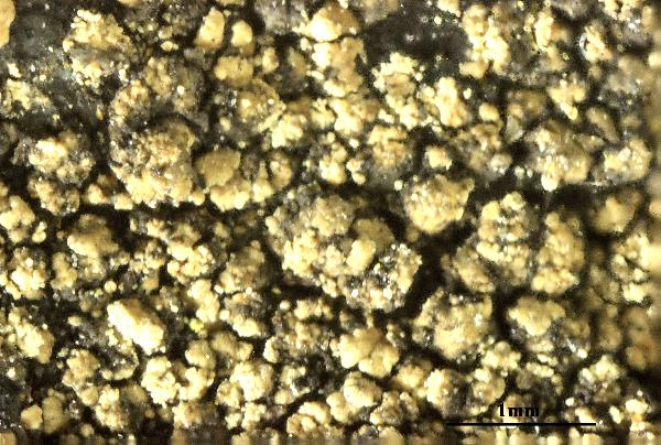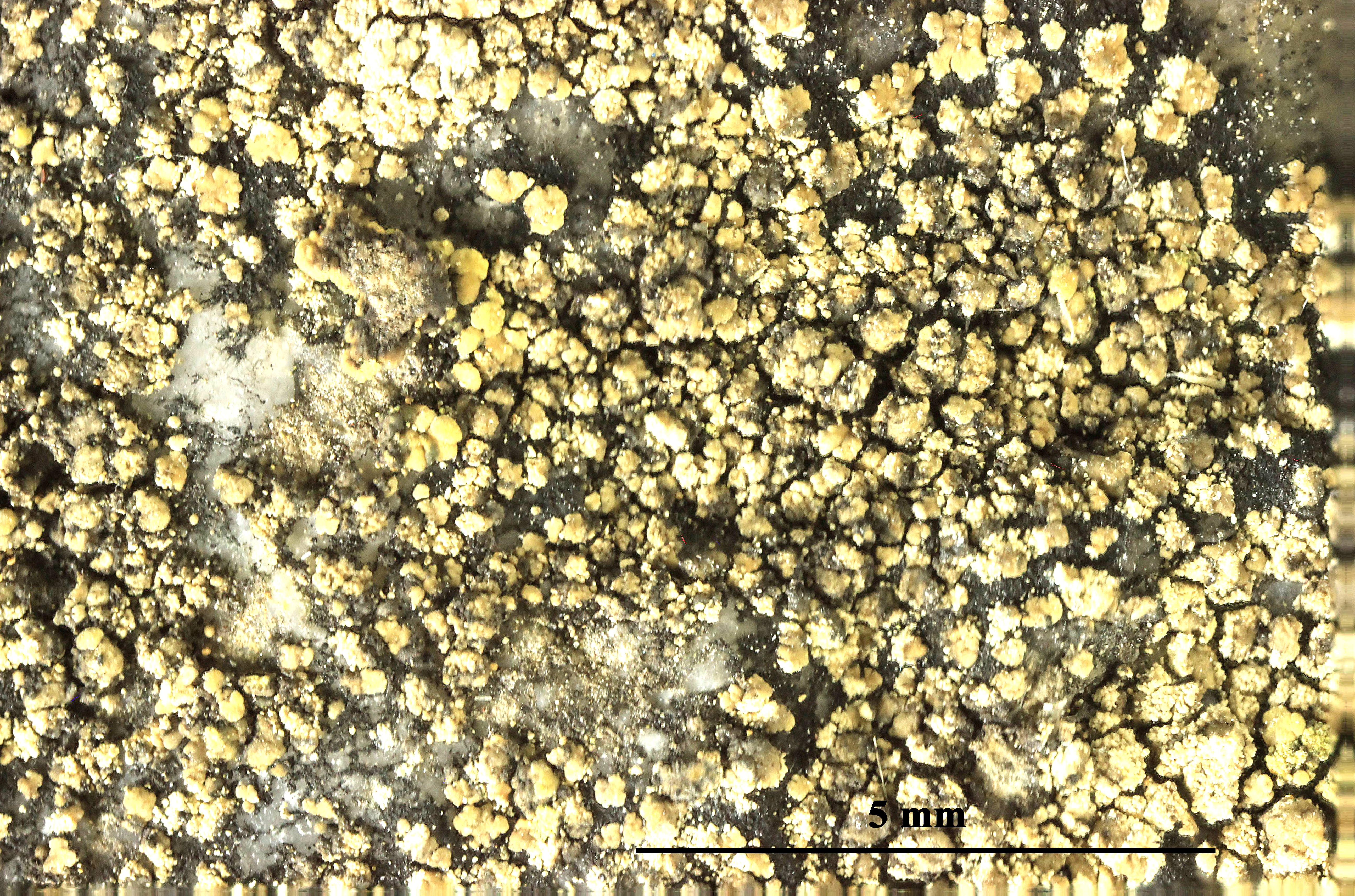 Description: Thallus crustose, episubstratic, of dispersed to contiguous, flat to usually convex, grey-green to yellowish grey areoles often developing on a black hypothallus, sorediate, the soredia whitish, grey-green or blue-grey, 20-30 μm thick, mainly arising from the margins of the areoles, later covering the whole surface. Medulla I-. Apothecia very rare, lecanorine, 0.2-0.5 mm across, sessile, with a pale reddish brown, sometimes blue-black-pruinose disc, and a persistent, not or only weakly raised, entire thalline margin. Epithecium colourless to pale yellowish brown, without crystals; hymenium colourless, 50-65 μm high; paraphyses branched and anastomosing, 1.5-2.5 μm thick, the apical cells not or only slightly swollen; hypothecium colourless. Asci 8-spored, clavate, Lecanora-type. Ascospores 1-celled, hyaline, ellipsoid, 8-13 x 5-7 μm. Photobiont chlorococcoid. Spot tests: thallus K-, C-, KC- or KC+ faintly yellow, P-, UV+ dull orange. Chemistry: usnic acid, zeorin.Note: on steeply inclined to rain-sheltered surfaces of metal-rich siliceous rocks in upland areas. The record from Campania (see Nimis 1993: 353) requires confirmation, and is not accepted here.