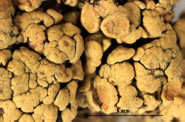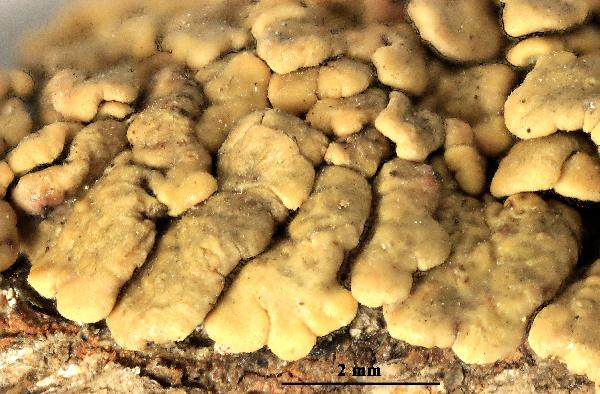 Description: Thallus crustose-subsquamulose, episubstratic, 5-30 mm wide, yellowish green, rarely yellowish brown in sun-forms, often with pinkish patches in the damaged parts, the areoles/squamules 0.5-3.5 x 0.6-2.4 mm, 0.5-1 mm thick, umbilicate, usually lobed, concave to convex, at first smooth, but soon turning rugose; lower surface at first whitish, then brown to black, with branched, up to 10 mm long, 0.1-0.4 mm wide, blackish, pale brown to pinkish rhizinose strands. Upper cortex 90-380 μm thick, prosoplectenchymatous, the upper part 30-60 μm thick, yellowish brown, filled with 0.5-4 x 0.5-1.5 μm large crystalline granules, with an epinecral layer, lower part colourless, without granules; algal layer discontinuous; medulla 30-45 μm thick, prosoplectenchymatous; lower cortex absent. Apothecia lecanorine, 1-4.5 mm across, often covering a large part of thallus, at first semi-immersed, then sessile and constricted at base to subpedicellate, with a slightly concave to slightly convex, yellowish brown to brown disc and a persistent, often flexuose thalline margin. Thalline exciple 500-650 μm thick laterally, corticate, the outer part filled with crystals; proper exciple 15-20 μm thick; epithecium yellowish brown, 10-15 μm high, with small crystals (0.5-4 x 0,5-1.5 μm); hymenium colourless, 45-60 μm high, the upper part with sparse small crystals; paraphyses strongly coherent, sparingly branched and anastomosing, 1.5-2 μm thick at mid-level, the apical cells 3-4.5 μm wide; hypothecium 70-135 μm high, prosoplectenchymatous. Asci 8-spored, clavate, very thin-walled, with a K/I+ blue, tall tholus penetrated by a faintly amyloid apical cushion, the wall K/I-, surrounded by a blue outer layer, Lecanora-type. Ascospores 1-celled, hyaline, ellipsoid to broadly ellipsoid, rather thick-walled (8-)9.5-12.5(-14.5) x (4.5-)5-7(-7.5) μm. Pycnidia colourless, immersed. Conidia needle-like, slightly curved, 17-28 x 0.5-1 μm. Photobiont chlorococcoid. Spot tests: cortex and apothecial margin K- or K+ pale yellow, C-, KC+ pale yellow, P-; medulla K-, C-, KC-, P-; pinkish parts K + reddish violet. Chemistry: usnic acid, plus an unidentified pigment in the pink-coloured parts. Note: a very rare species growing on easily exfoliable metamorphic rocks in open, wind-exposed and snow-free sites in upland areas, reported from Central Spain, Southern France and Sardinia. For further details see Poelt & al. (1983) and Roux (2009).