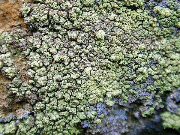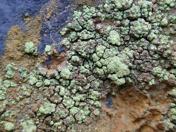 Description: Thallus crustose, episubstratic, areolate-subsquamulose, yellowish grey to sulphur yellow, forming continuous crusts or more rarely consisting of dispersed, flat to slightly convex, crenulate, 0.5-1.5(-3) mm wide areoles with marginal, bright sulphur-yellow, finely granular, 30-70 μm thick soredia which rarely coalesce into a sorediate crust. Apothecia rare, lecanorine, 0.2-0.8 mm across, sessile, more or less immersed amongst the soredia, with a concave to flat, red-brown to olivaceous brown, epruinose disc and a well-developed, persistent, often sorediate thalline margin. Epithecium red-brown to olive-green, with a few granules; hymenium colourless, 45-60 μm high; paraphyses mostly simple, slightly thickened at apices; hypothecium colourless, inspersed with oil droplets. Asci 8-spored, clavate, Lecanora-type. Ascospores 1-celled, hyaline, broadly ellipsoid to subglobose, 7-10 x 6-8 μm. Photobiont chlorococcoid. Spot tests: K-, C-, KC-, P+ orange-red, UV+ bright orange. Chemistry: rhizocarpic acid, pannarin, zeorin.