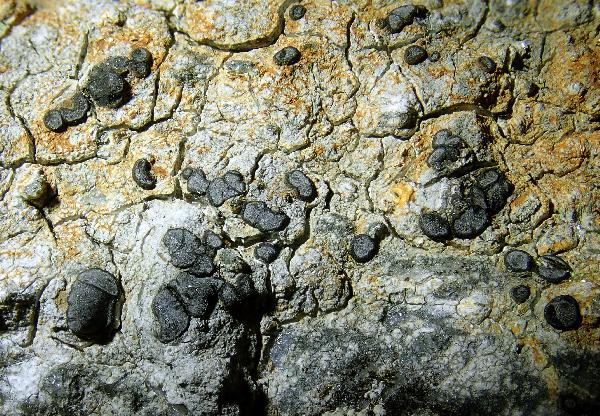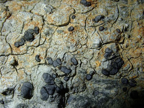 Description: Thallus crustose, usually thinly episubstratic, continuous to rimose-areolate, grey-white to ochraceous, sometimes patchily rust-red on iron-rich substrata, the areoles flat to slightly convex, forming large patches and sometimes mosaics, the individual thalli separated by black lines; sometimes however the thallus is poorly developed and hardly evident. Medulla white, I-. Apothecia lecideine, black to brown-black but turning dark red-brown when wet (wait for a few minutes), appressed-adnate to finally sessile, not constricted at base, 0.3-1.5(-2) mm across, round to irregular in outline by mutual compression, with an often cracked to deeply split, flat to slightly convex, blue-pruinose (in young apothecia) to epruinose disc, and a flexuose, raised, persistent proper margin. Proper exciple dark brown to greenish brown in outer part, colourless or pale brown within, of intricate-radiating hyphae, the marginal cells thin-walled, 1-3 µm thick, the medullary part filled with minute crystals; epithecium brown to rarely olive-brown, K-, N+ purple-red; hymenium colourless, 40-75(-80) µm high, I+ blue; paraphyses coherent, simple or rarely branched, 1.5-2 µm thick at mid-level, the apical cells 3-4 µm wide; hypothecium colourless, I+ intensively blue. Asci 8-spored, narrowly clavate, thick-walled, with a K/I+ pale blue tholus and a strongly amyloid, thin apical cushion, surrounded by a I+ blue outer layer, Lecidea-type. Ascospores 1-celled, hyaline, narrowly ellipsoid, sometimes pseudodiblastic (containing 2 large oil droplets), 9-15 x (3.5-)4-7 µm. Pycnidia dark, immersed. Conidia bacilliform, 12-18 µm long. Photobiont chlorococcoid. Spot tests: cortex and medulla K-, C-, KC-, P-, UV-. Chemistry: planaic acid (major), 4-0-demethylp1anaic acid (usually traces).Note: an ecologically wide-ranging, pioneer species found on vertical to slightly inclined surfaces of acid siliceous rocks close to the ground, also on iron-rich substrata, with optimum above the montane belt. The world distribution was mapped by Hertel (2006).