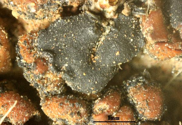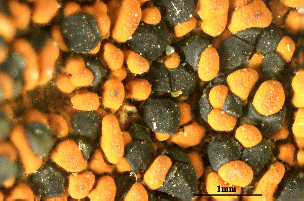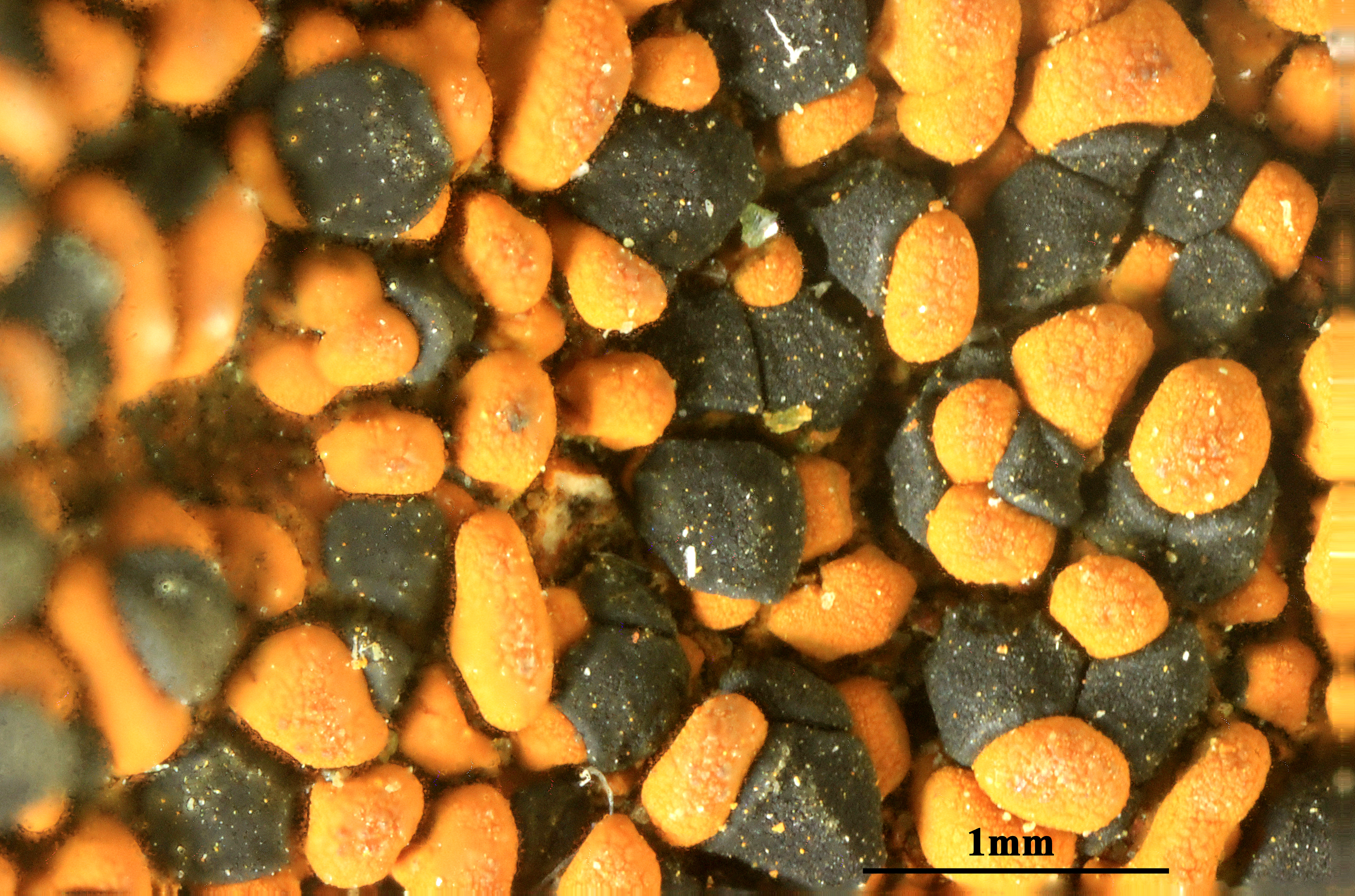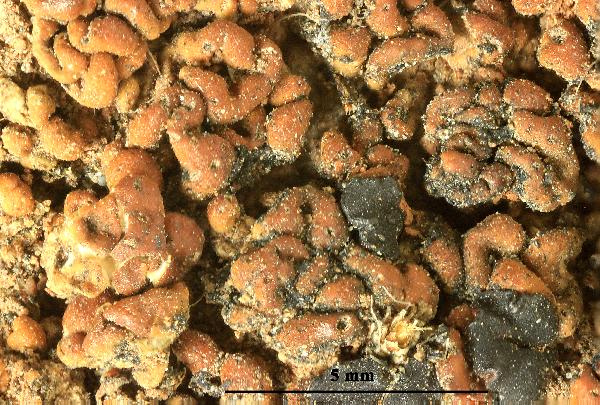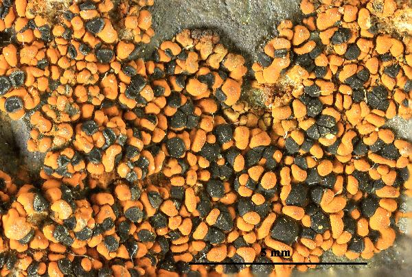 Description: Thallus crustose, episubstratic, rather thick, areolate-verrucose, ochre to rust-red, without a distinct prothallus, the areoles convex to bullate, 0.3-1(-1.5) mm wide, matt. Medulla white, I+ blue. Apothecia lecideine, black, 0.5-1.5(-2) mm across, arising between the areoles, sessile and constricted at base, with a flat to convex disc and a usually persistent, sometimes finally excluded, raised, often sinuous proper margin. Proper exciple with a thick, brown-black to green-black cortex reacting N+ purple, more or less colourless within; epithecium bright blue-green or green-black, N+ purple; hymenium colourless of pale green in upper part, 40-70 µm high; paraphyses sparingly branched and anastomosing, 1.5-2 µm thick at mid-level, the apical cell to 5 µm wide; subhymenium pale blue-green, well-differentiated from the pale to dark brown, sometimes substipitate hypothecium. Ąsci 8-spored, clavate, Lecidea-type. Ascospores 1-celled, hyaline, ellipsoid to broadly ellipsoid, (7-)8-15(-17) x 4.5-6(-7) µm, 1.6-2 times as long as wide. Pycnidia dark. Conidia bacilliform 8-12 x c. 1 µm. Photobiont chlorococcoid. Spot tests: thallus K-, C-, KC-, P-, UV-. Chemistry: without lichen substances, or sometimes with porphyrilic acid, rarely with low amounts of stictic or norstictic acids.Note: a probably circumpolar, arctic-alpine to boreal-montane lichen (Hertel 2006) found on iron-containing rocks in humid, sheltered situations, mostly in upland areas. The sample from Valle d’Aosta was collected by B. Feige near Plan Masson near Breuil, at 2500 m.