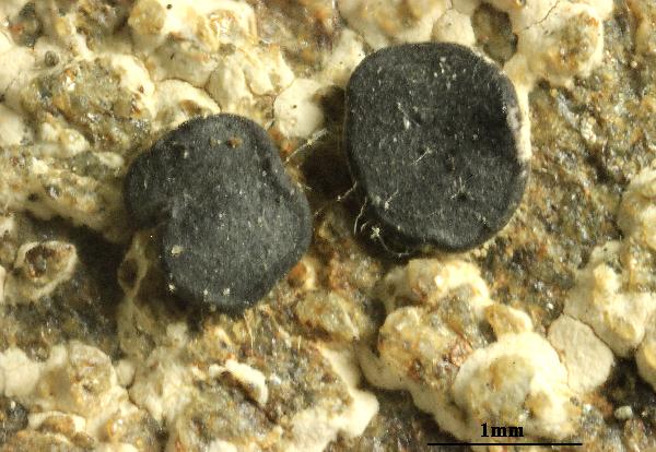 Description: Thallus crustose, episubstratic, continuous or rimose, chalky white, often with a bluish tinge, 0.2-1.2 mm thick, most often without a clear prothallus, rarely delimited by a thin dark prothalline line. Medulla white, I+ deep blue. Apothecia lecideine, black, epruinose, (0.2-)0.4-2(-3) mm across, with a flat to finally strongly convex disc and a persistent, raised, wavy proper margin. Proper exciple green-black to brown-black along a thin outer rim, colourless or pale grey within, C+ orange-red; epithecium green-black, K-; hymenium bright blue green, rarely brownish or colourless, 50-70 µm high; paraphyses coherent, simple or forked in upper part, c. 2 µm thick at mid-level, the apical cells hardly swollen, to 2.6 µm wide; hypothecium dark brown, K-. Asci 8-spored, clavate, Lecidea-type. Ascospores 1-celled but often pseudodiblastic, hyaline, ellipsoid, 6-12 x 3.5-6.5 µm, not halonate, thin-walled. Pycnidia black, globose, immersed. Conidia bacilliform, 5-15 x 0.8-1.5 µm. Photobiont chlorococcoid. Spot tests: thallus K- or K+ faintly yellow, C-, KC-, P-. Chemistry: thallus and exciple with 2'-O-methylanziaic acid. Note: a lichen known from the central and southern European mountains (Alps, Pyrenees, Cordillera Cantabrica in Spain, Tatra Mountains), found on steeply inclined, superficially decalcified calciferous rocks or on lime-containing siliceous rocks, with optimum in upland areas, up to the nival belt in the Alps. The world distribution was mapped by Hertel (2006). The record from Abruzzo (Gran Sasso) is the southernmost in Europe.