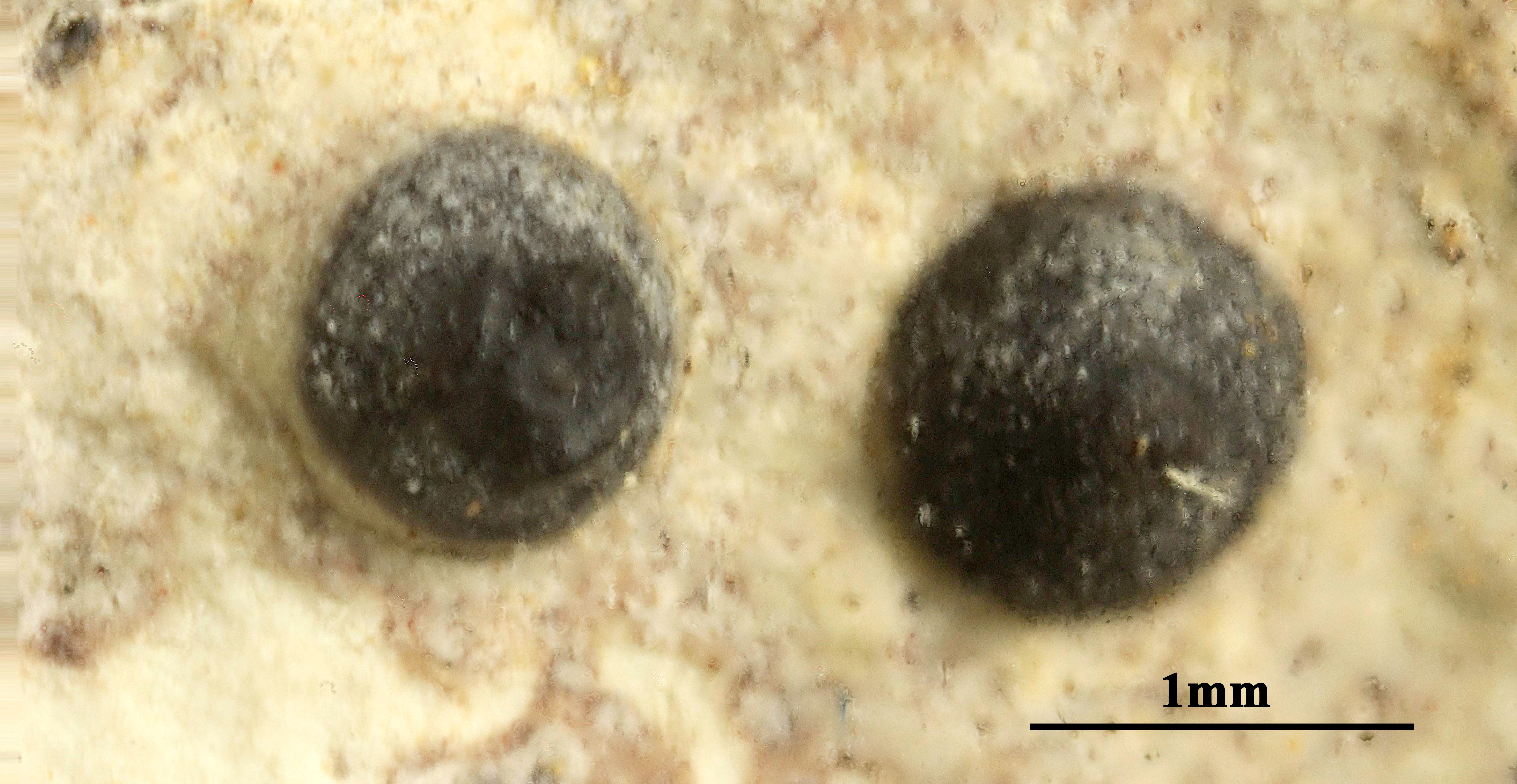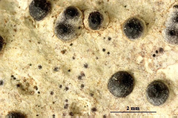 Description: Thallus crustose, endosubstratic or thinly episubstratic, continuous to rimose around the perithecia, whitish to violet-grey. Perithecia black, 0.4-1 mm across, half-immersed, hemispherically projecting with the upper half, with an apical ostiole. Exciple carbonized in the upper half, colourless to pale brown in lower half, up to 120 µm thick; hamathecium of persistent, slender, 1-2 µm thick, sparingly branched paraphyses; hymenial gel K/I+ blue or partly orange. Asci (6-)8-spored, cylindrical, without ocular chamber, the wall K/I-. Ascospores 3-distoseptate, not constricted at septa, hyaline, spindle-shaped with subacute ends, 17-22 x (6-)8-10(-12) μm, uniseriately arranged in the asci, without a perispore. Photobiont trentepohlioid. Spot tests: K-, C-, KC-, P-, UV-. Chemistry: without lichen substances.Note: a subtropical species of sheltered, warm-humid, shaded surfaces of calcareous rocks, usually not far from the sea; to be looked for further in Tyrrhenian Italy.