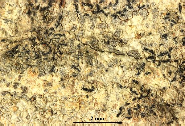 Description: Thallus crustose, episubstratic, whitish grey to pale brown, effuse, rimose-cracked, 0.1-0.5(-1) mm thick, without a distinct prothallus. Apothecia arthonioid, round to angular, sometimes lobed, immersed to slightly erumpent, sometimes finally sessile, 0.3-0.7(-1) mm across, 0.1-0.25 mm tall, with a pinkish brown to dark brown, but heavily grey- to white-pruinose disc (calcium oxalates), without a distinct proper margin. Proper exciple poorly developed, of peripheral hyphal structures with crystals of calcium oxalates between hyphae; epithecium reddish brown, c. 15 µm high, covered in a thick layer of crystals, K+ grey or pale green; hymenium colourless to pale reddish brown, (40-)45-60 µm high, I+ blue rapidly turning red, K/I+ blue; paraphysoids branched and anastomosing, c. 1.5 µm thick, the apical cells up to 2.5 µm wide, with brown walls; hypothecium colourless, (70-)90-150(-170) µm high, I+ pale blue. Asci 8-spored, broadly clavate, semi-fissitunicate, with a large apical dome and a distinct ocular chamber, the tholus K/I-, Arthonia-type, 40-55 x 17-25 µm. Ascospores (3-)4-5-septate, hyaline, narrowly obovate, slightly pointed at one end, the upper cell not enlarged, (11-)14-17(-24) x (4-)5-7(-8) µm, without a distinct epispore. Pycnidia rare, immersed, 0.1-0.2 mm across, pale to red brown, the wall colourless or pale red-brown in which case it reacts K+ pale green. Conidia thread-like, usually curved, 10-16 x 0.5-1 µm. Photobiont trentepohlioid. Spot tests: thallus and apothecial pruina K-, C+ red, P-, UV-. Chemistry: arthoniaic acid. Note: a mild-temperate lichen found on isolated, old deciduous trees, especially oaks, in parts of the boles seldom wetted by rain, restricted to humid areas; presently extremely rare in Northern Italy, more frequent in Tyrrhenian Italy. It is included in the Italian red list of epiphytic lichens as “Near-threatened” (Nascimbene & al. 2013c). The record from Venezia Giulia cited by Nimis (1993: 82) was due to a misidentification.