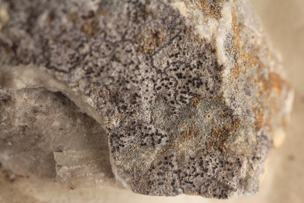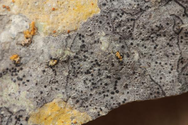 Description: Thallus crustose, endosubstratic to hemiendosubstratic in older parts, whitish to pale grey, sometimes with a brownish hue, with numerous, up to 100 μm wide flecks, smooth, delimited from adjacent conspecific thalli by sunken to slightly raised, single or double dark brown lines, the whole forming a clear mosaic. Pseudocortex formed by a thin prosoplectenchyma intermingled with microcrystals, sometimes with an upper layer of slightly pigmented cortical cells; medulla prosoplectenchymatous, white, K/I+ faintly violet, without macrosphaeroids. Perithecia black, immersed in the rock with only the black apex visible, or forming 0.2-0.35 μm wide, black projections, sometimes leaving poorly defined pits in the rock. Involucrellum confined to the apex of exciple or spreading sideways and downwards up to c. mid-level, 30-40 μm thick; exciple colourless to pale brown; hamathecium of periphyses and 15-20 μm long periphysoids, interascal filaments absent; hymenial gel hemiamyloid, I+ red (I+ blue at very low concentrations of I), K/I+ blue. Asci 8-spored, clavate, I-, fissitunicate, the wall thickened above, with an ocular chamber, dehiscent by extrusion of an endotunica to form a delicate rostrum, Verrucaria-type. Ascospores 1-celled, hyaline, ellipsoid (11-)13-20 x (5-)6-9 μm. Photobiont chlorococcoid. Spot tests: K-, C-, KC-, P-, UV-. Chemistry: without lichen substances.Note: on steeply inclined surfaces of compact limestone and dolomite in sheltered situations; optima in the submediterranean belt (in Northern Italy), and in the montane belt (in Southern Italy), much rarer, and mostly coastal, in shaded-humid situations of the eu-Mediterranean belt. The species differs from P. dufourii in the smaller, less prominent perithecia, and the thalli typically in a mosaic with conspecific thalli, separated by dark lines; the lines produced by one thallus typically do not merge completely with that of its neighbour, so the lines often appear double (Orange 2013).