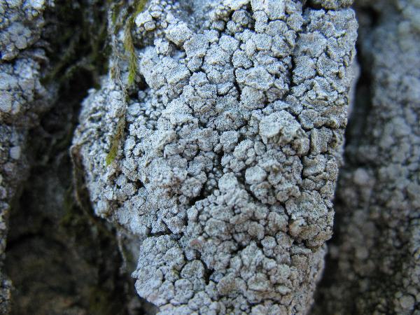 Description: Thallus crustose, episubstratic, continuous to fissured, whitish, pale grey or pale greenish grey, often weakly zoned at margin, delimited by a white prothallus, sorediate, tasting extremely bitter. Central parts of thallus with numerous, circular, 0.5-1.5(-2) mm wide, white, usually convex to hemispherical soralia which long remain discrete and are sometimes arranged in concentric lines, rarely becoming confluent in central parts. In some forms the thallus is denseluy covered in warts that break down apically into small, elevated, punctiform soralia, never forming discrete round soralia. Apothecia extremely rare, immersed in soralia-like warts and not visible without sectioning the warts, the disc densely white-pruinose. Hymenium colourless, the hymenial gel not or only weakly amyloid; paraphyses lax, branched and richly anastomosing; hypothecium colourless. Asci 1-spored, broadly cylindrical, the apex without a distinct ocular chamber, the outer sheath K/I+ blue, otherwise K/I–, with an inner extensible layer, Pertusaria-type. Ascospores 1-celled, hyaline, ellipsoid, 130-150 x 40-50 µm. Photobiont chlorococcoid. Spot tests: cortex K- or K+ yellow turning orange-red, C-, KC-, P- or P+ yellow to red; soralia and medulla K- or K+ yellow turning orange-red, C-, KC+ fleeting violet, P- or P+ yellow to red, UV-. Chemistry: picrolichenic acid; a chemotype with additional protocetraric and conprotocetraric acids is also widespread. Note: a widespread holarctic lichen, certainly the most common epiphytic species of the genus throughout Italy, with a wide ecological range. It often behaves as an aggressive competitor, being able to overgrow other crustose lichens and sometimes even bryophytes. According to Craighero (2010) two chemotypes are present in Italy, one with the pycrolichenic acid syndrome only, the other with additional protocetraric acid; the two chemotypes have a somewhat different distribution within the country, the latter being most frequent in Tyrrhenian Italy.