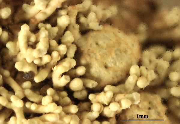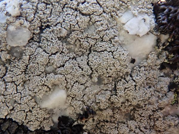 Description: Thallus crustose, episubstratic, continuous to rimose, grey, sometimes with a pale yellowish brown tinge towards the centre, 1.5-4 mm thick, isidiate, forming up to 12(-15) cm wide patches, often delimited by a whitish prothallus. Medulla white, not amyloid. lsidia abundant, cylindrical or tapering from base, simple or coralloid, up to 1.5(-2) mm high, 0.1-0.3 mm thick, irregularly oriented, with concolourous tips. Apothecia very rare, immersed in number of 2-4(-10) into heavily pruinose, up to 1.5(-2) mm wide thalline warts which are constricted at base, the disc at first punctiform, later more or less expanded and 0.3-0.5 mm across, pale to dark brown, often faintly white-pruinose. Hymenium colourless, the hymenial gel not or only weakly amyloid; paraphyses lax, branched and richly anastomosing; hypothecium colourless. Asci 2-spored, broadly cylindrical, the apex without a distinct ocular chamber, the outer sheath K/I+ blue, otherwise K/I–, with an inner extensible layer, Pertusaria-type. Ascospores 1-celled, hyaline, ellipsoid, 80-150(-180) x 40-80 μm, the wall 2-3 μm thick, not zoned nor striate. Photobiont chlorococcoid. Spot tests: thallus K+ bright yellow to yellow-orange, C-, KC+ more or less faintly yellow, P+ yellow-orange, UV-. Chemistry: thamnolic acid.Note: a cool-temperate to boreal-montane lichen found on steeply inclined surfaces of siliceous rocks in rainy areas, where it is sometimes very abundant; most frequent in the Alps, rarer elsewhere, ranging south to the mountains of Sicily.