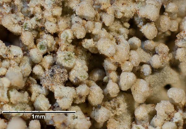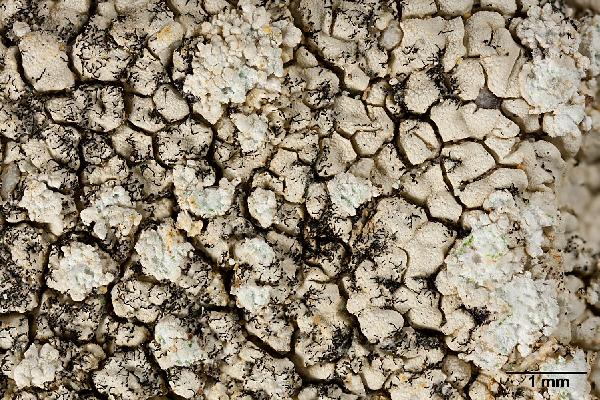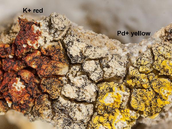 Description: Thallus crustose, episubstratic, rather thick, markedly cracked and areolate, whitish grey, sometmes with a pinkish huye, matt, sorediate, often delimited by a thin, pale prothallus. Areoles flat to slightly convex, irregular in outline, more or less angular, (0.2-)0.5-1(-2) mm wide, finely warted-papillate. Soralia abundant, white, 0.5-1(-1.5) mm across, excavate to finally strongly convex, slightly paler than the areoles, discrete to finally confluent, bursting from the thalline warts and finally covering almost the whole thallus surface; soredia coarsely granular. Apothecia extremely rare, often aborting, hidden beneath the soredia. Ascospores unknown. Photobiont chlorococcoid. Spot tests: soralia K+ yellow turning blood red (needle-like crystals), C-, KC+ yellow-red, P+ yellow-orange, UV+ pale grey or grey-yellow. Chemistry: norstictic acid (major), salazinic acid (minor or traces), plus a UV+ yellow xanthone. Note: on steeply inclined surfaces of sheltered siliceous rocks, probably more widespread also in the Alps.