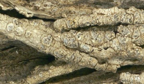 Description: Thallus crustose, thinly episubstratic, white-grey or with a yellow-brown tinge, continuous to rimose-areolate. Apothecia numerous, crateriform, not constricted at base, immersed into 0.5-1.5 mm wide fertile warts, with an initially punctiform, later irregularly open, black disc covered in a thick, white pruina, and a prominent thalline margin. Epithecium yellowish green, K+ and N+ pink-violet; hymenium colourless; paraphyses rather lax, branched and anastomosing; hypothecium colourless. Asci 1-spored, broadly cylindrical, the apex with a broad ocular chamber, the outer sheath K/I+ blue, otherwise K/I-, with an inner extensible layer, Pertusaria-type. Ascospores 1-celled, hyaline, ellipsoid, 120-190 x (40-)60-75(-90) µm, double-walled, the wall 5-8 µm thick, faintly transversally striate. Photobiont chlorococcoid. Spot tests; thallus K+ pale yellow, C-, KC+ yellow orange P-, UV+ orange. Chemistry: planaic acid (major), 4-O-dimethylplanaic acid, plus traces of thiophaninic acid, atranorin (trace), 2,4-dichloronorlichexanthone, and an unidentified substance.Note: this species was described from the Iberian Peninsula, where it mostly grows on Juniperus thuriferain the supramediterranean belt, but also on J. phoenicea and J. oxycedrus in the eu-Mediterranean belt. According to Sipman (in litt.), who has studied the specimen, the earlier record of P. rhodiensis from Basilicata (see Nimis 1993: 519) refers to P. paramerae. The species, which is also known from Turkey, is chemically variable (see Halici & al. 2010).