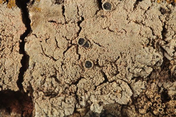 Description: Thallus foliose, heteromerous, dorsiventral, narrow-lobed, forming orbicular, closely adpressed, up to 4 cm wide rosettes, the lobes flat to concave, (0.3-)0.5-0.8(-1.2) mm wide, sparingly branched, dull white, the central parts often covered by isidia-like pustules dissolving into granulose soredia that may fuse and cover the whole thallus. Lower surface white at lobe-tips, darker in central parts, with a few, concolorous, mostly simple rhizines. Upper cortex paraplectenchymatous; medulla white; lower cortex pseudoparenchymatous. Apothecia rather rare, lecanorine, 0.5-1.5(-2) mm across, with a black, sometimes thinly pruinose disc and an often crenulate, isidiate-sorediate margin. Epithecium brown; hymenium and hypothecium colourless; paraphyses slender, simple or forked in upper part, the apical cells clavate, with a thin, dark brown cap. Asci 8-spored, clavate, the K/I+ blue tholus penetrated by a faintly amyloid apical cushion with parallel or diverging flanks, the wall K/I-, surrounded by a K/I+ blue outer layer, Lecanora-type. Ascospores 1-septate, brown, ellipsoid, 15-20(-24) x 7-11 µm, Pachysporaria-type. Pycnidia rare. Conidia bacilliform. Photobiont chlorococcoid. Spot tests: upper cortex and medulla K+ yellow, C-, KC-, P+ faintly yellow. Chemistry: uppper cortex with atranorin; medulla with matranorin, lecotylin and traces of other triterpenoids. Note: a Mediterranean to mild-temperate, mainly western species growing on more or less isolated trees; rare throughout the country, but most frequent in Tyrrhenian Italy and in the upper Friulian plain (humid-rainy climate).
