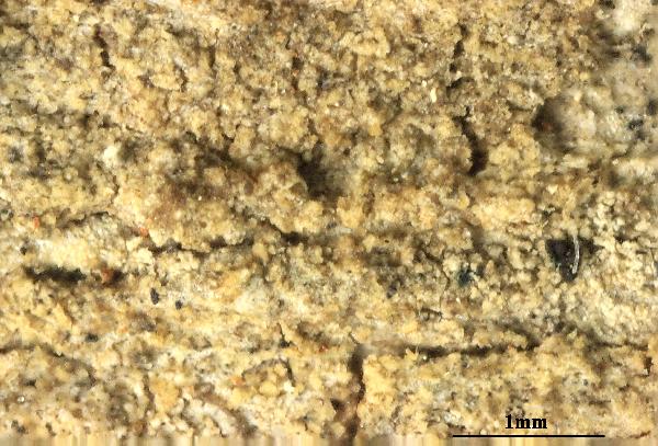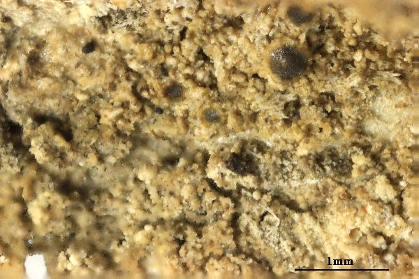 Description: Thallus crustose, episubstratic, dull olivaceous brown, epruinose, continuous to rimose-areolate, densely covered in 0.07-0.15 mm wide and up to 0.4 mm high blastidia-like granules with a one cell-layer thick, rudimentary cortex, the upper granules forming by budding from those beneath. Apothecia very rare, lecanorine, up to 0.7 mm across, sessile, with a slightly concave to flat, olivaceous grey disc and a thick thalline margin even with disc. Epithecium brownish; hymenium colourless, c. 55 μm high; paraphyses coherent, branched in upper part, c. 2 μm thick at mid-level, the apical cell c. 3 μm wide; hypothecium colourless; algal layer incomplete below hypothecium. Asci 8-spored, clavate, approaching the Lecanora-type, with a well-developed amyloid tholus and a distinct, non-amyloid axial mass. Ascospores 1-celled, hyaline, oblong, 9.5-15 x 3-3.5 μm. Photobiont chlorococcoid. Spot tests: cortex and medulla K-, C-, KC-, P-, UV-; thallus sections release oily exudates in K. Chemistry: traces of lobaric acid and unidentified substances. Note: mostly on lignum, more rarely on acid bark in damp deciduous forests. This "western" species should be looked fore more intensively in Tyrrhenian Italy. The record from Lombardy is a "virtual" record. Sphinctrina anglica, an obligate parasite of this species, was reported from this region (see Nimis 1993: 659), based on Anzi, Lich. Lang. 212.