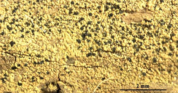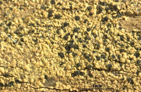 Description: Thallus leprose-granular, episubstratic, ecorticate, continuous to cracked, effuse, grey to green, < 0.3 mm thick, entirely consisting of elongate or irregularly shaped, often confluent granules measuring 14-33 x 7-14 µm. Apothecia rare, biatorine, convex to subglobose, immersed in the thallus, sometimes tuberculate, 0.1-0.3(-0.4) mm across, with a dark brown to blue-black disc (pale grey-brown or pale bluish grey in shade-forms), without a distinct margin, but often surrounded by a basal white rim of excipular hyphae. Proper exciple poorly developed, often with protruding hyphae; epithecium pale green to blue-green, olivaceous or greenish black, K+ greenish, N+ purple-red; hymenium greenish, I+ blue; paraphyses simple or forked, the apical cells hardly swollen; hypothecium colourless or pale green, all greenish parts N+ purple-red. Asci cylindrical-clavate, the apical dome K/I+ pale blue, with a dark blue apical tube diverging towards the apex, the wall with a K/I+ dark blue outer layer. Ascospores 1-celled, hyaline, oblong-ovoid to tear-shaped, 4-7 x 1.2-2 µm. Conidiomata frequent, hyphomycetous, superficial, the thallus surface often with scattered, elongated conidiogenous cells. Conidia oblong, 7-15 x 2-2.3 µm. Photobiont chlorococcoid, the cells longer than wide, Stichococcus-like. Spot tests: thallus K-, P-, KC-, C-, P-, UV- or UV+ ice-blue. Chemistry: thallus apparently without lichen substances, or with one to two UV+ unknowns and terpenoids other than zeorin.Note: on acid siliceous stones and consolidated soil, on banks or on the roots of fallen trees, on dry surfaces protected from rain, mostly in the deciduous forest belts; perhaps overlooked and more widespread, but certainly rare in Italy.