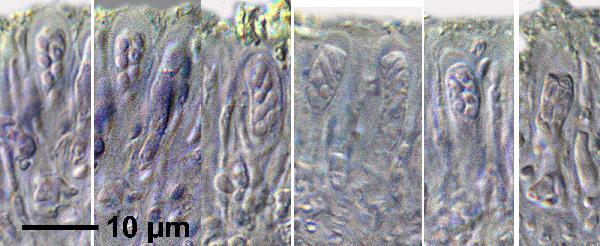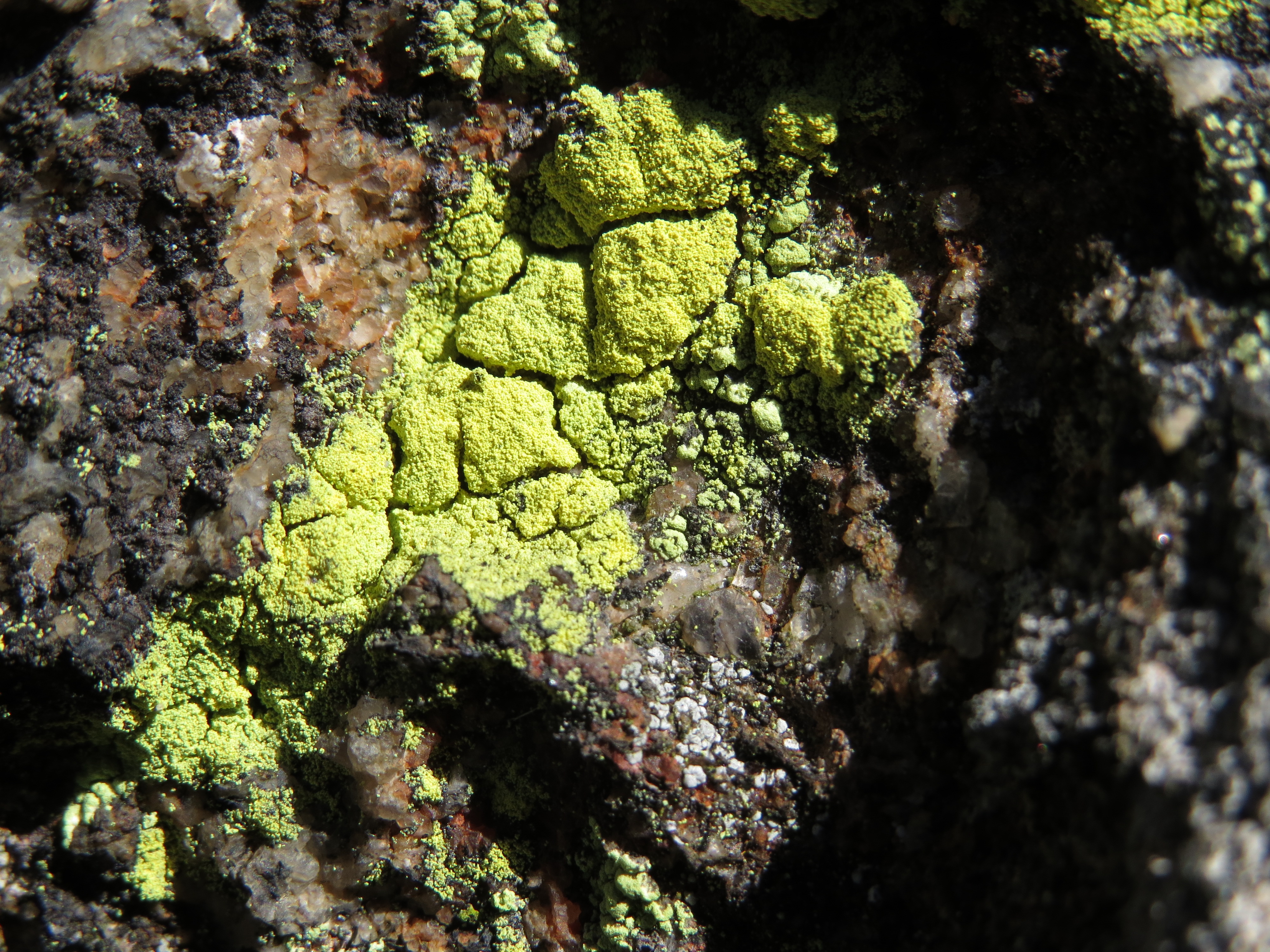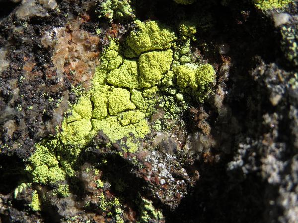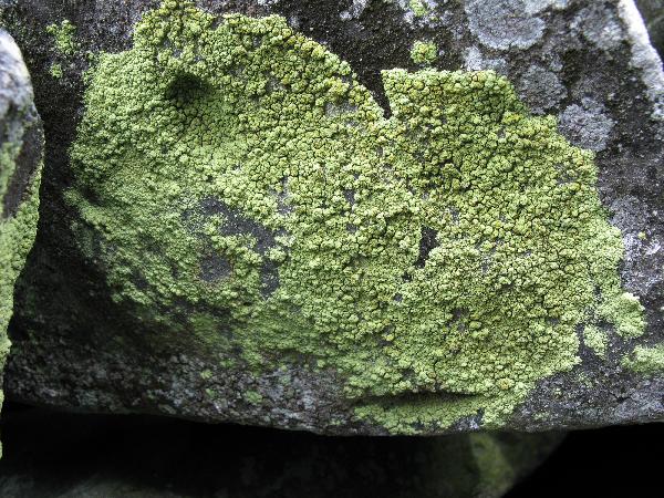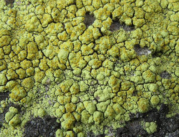 Description: Thallus leprose-granular, episubstratic, ecorticate, continuous to cracked, effuse, bright sulphur yellow to yellow-green in shade-forms, entirely consisting of mainly farinose, more or less globose, 10-35(-60) µm wide goniocysts surrounded by irregularly arranged hyphae and interspersed with numerous, large, colourless crystals insoluble in K, visible in squash preparations. Apothecia rather rare, biatorine, convex to subglobose, immersed in the thallus, 0.1-0.3 mm across, sometimes confluent, tuberculate and up to 0.8 mm across, with a yellow-green to pale or lemon yellow or yellow-orange to olivaceous or brownish yellow disc, without a distinct margin. Proper exciple very poorly developed; epithecium intensely yellow-green, with small yellow crystals not dissolving in K, K-, N-; hymenium colourless, 25-35 µm high, I+ blue; paraphyses simple or forked, the apices hardly swollen; hypothecium colourless. Asci 8-spored, cylindrical-clavate, the apical dome K/I+ pale blue, with a dark blue apical tube diverging towards the apex, the wall with a K/I+ dark blue outer layer. Ascospores 1-celled, hyaline, oblong-ovoid, 4-5(-7) x 1-2(-2.5) µm. Photobiont chlorococcoid, the cells rounded, up to 10 µm wide. Spot tests: thallus and apothecia K-, P-, KC-, P-, UV+ dull orange. Chemistry: rhizocarpic acid (major) and an unidentified pigment (trace).Note: on surfaces of siliceous rocks protected from rain in humid areas, but also on a wide range of substrata (soil, exposed roots, bases of ancient trees), with a correspondingly wide altitudinal range; in Italy it is restricted to natural habitats and is most frequent in the Alps and the in the most humid parts of the Mediterranean belt.