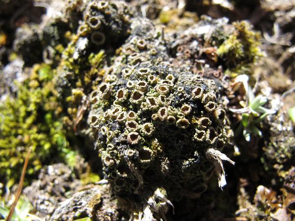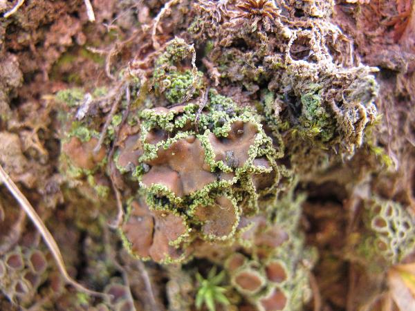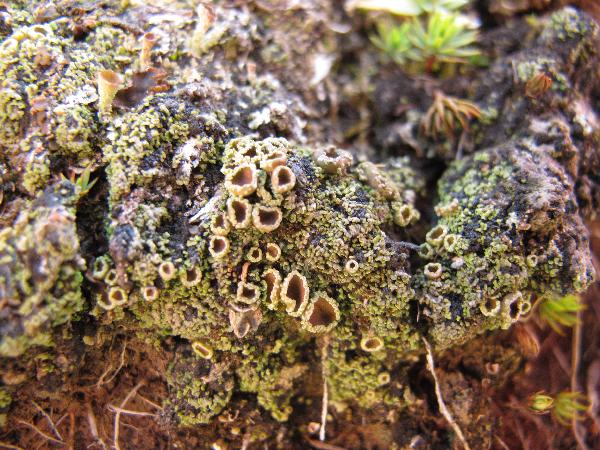 Description: Thallus crustose to subsquamulose, green-grey to yellowish brown in sun-forms, bright green when wet, thick, areolate-lobulate, the areoles subgranular to mostly subsquamulose, contiguous to imbricate, 0.2-0.5 mm wide, with interspersed, darker, blue-grey to brown, more granular squamules containing Nostoc (cephalodia). Upper and lower cortex paraplectenchymatous, 30-40 µm thick; medulla white, very thin, often indistinct, of loosely reticulate hyphae. Apothecia lecanorine, sessile, up to 5 mm across, with a brown, concave, smooth disc and a persistent, verruculose thalline margin with numerous squamules and sometimes a short white tomentum in the outer, lower part only. Thalline exciple 100-200 µm thick; proper exciple poorly developed, subparaplectenchymatous, 20-25 µm thick; epithecium brownish; hymenium colourless, 100-130 µm high, I+ dark blue; paraphyses simple, submoniliform, up to 4.5 µm thick, the apical cells not swollen; hypothecium colourless. Asci 8-spored, narrowly ellipsoid or cylindrical, the apex with a K/I+ deep blue central tube in a paler-staining tholus, and an internal, K/I+ dark blue ring-structure. Ascospores 1-celled, hyaline, ellipsoid, apiculate at one or both ends, thick-walled, measuring (13-)15-26 x 7-10 µm without the epispore, (19-)22-34 x 8-12 µm with the warted-ridged epispore. Pycnidia rare, pale brown, globose, semi-immersed. Conidia bacilliform, 5-6 x 1-2 µm. Photobiont chlorococcoid in thallus, cyanobacterial (Nostoc) in cephalodia. Spot tests: cortex and medulla K-, C-, KC-, P-, UV-. Chemistry: without lichen substances.Note: an arctic-alpine to boreal-montane, circumpolar lichen found on soil, often in and amongst bryophytes over siliceous substrata, in moist habitats near or above treeline; most frequent in the Alps, where it can reach the nival belt, much rarer along the Apennines.