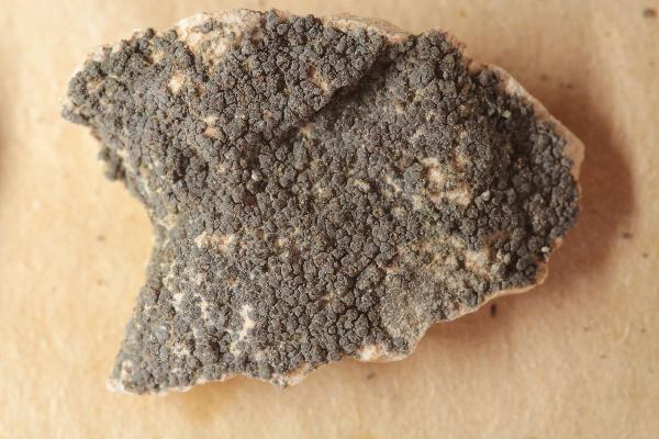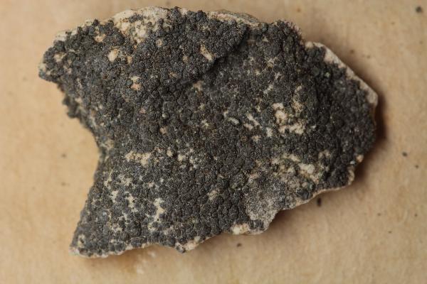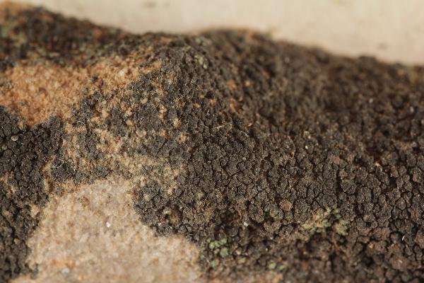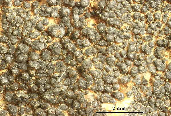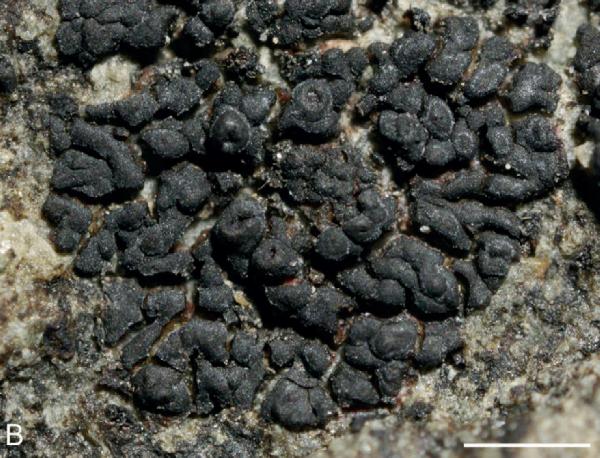 Description: Thallus crustose-placodioid, episubstratic, rimose-areolate, black when dry (sometimes bluish-pruinose), dark olive-brown and weakly subgelatinous when wet, forming up to 2 cm wide, orbicular to irregular rosettes, Areoles 0.4-0.7 mm wide, c. 0.2 mm thick, separated by thin fissures, the central ones often reduced to wart-like granules, the peripheral ones distinctly elongated and radiating, up to 0.8(-0.9) x 0.3-0.5 mm, contiguous or slightly diverging at tips, slightly concave to slightly convex, sometimes poorly evident in old thalli. Thallus anatomy paraplectenchymatous throughout, with short-celled, 3-9 µm thick hyphae arranged in a fan-like way. Apothecia zeorine pycnoascoarps, at first immersed, then emerging and semi-sessile, round, 0.25-0.5 mm across, with a concave to flat, dark reddish disc and a thick, persistent, sometimes minutely granulose proper margin. Proper exciple well-developed, cupuliform, prosoplectenchymatous, up to 25 µm thick; epithecium brownish, poorly differentiated; hymenium colourless, in mature apothecia subdivided into separate compartments by bundles of sterile hyphae, 100-130 µm high, I+ and K/I+ blue; paraphyses anastomosing, slightly constricted at septa in upper part, 2-3 µm thick, not capitate; hypothecium colourless, 30-50 µm high. Asci 16-32-spored, prototunicate, with a very thin wall disintegrating or opening by apical ruptures, without apical amyloid thickenings, Lichina-type. Ascospores 1-celled, hyaline, subglobose to broadly ellipsoid, (5-)6-12 x 3-6(-7) µm. Pycnidia immersed, unilocular or rarely secondarily plurilocular, 80-120 µm wide. Conidia globose or subglobose, 2-3 x 1.5-2 µm. Photobiont cyanobacterial, chroococcoid, with vertically arranged clusters of cells measuring 6-10 x 5-7 µm, penetrated by haustoria and surrounded by a yellowish brown gelatinous sheath. Spot tests: all negative. Chemistry: without lichen substances.