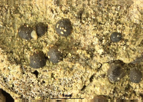 Description: Thallus crustose, areolate, ochraceous to pale brown, finally entirely covered with yellowish brown, dark grey-green, olivaceous to brown, up to 25-30 μm wide blastidia. Apothecia frequent, at first lecanorine, but soon becoming biatorine, 0.3-0.5(-0.8) mm across, with a brown to brown-black, concave to finally convex disc, the young ones with a thin, entire thalline margin which disappears in older apothecia. Thalline exciple ecorticate, 50-70 μm wide laterally, filled with small crystals reacting P+ orange-red; proper exciple indistinct laterally, to 20 μm thick in upper part; epithecium orange-brown, with a granular epipsamma reacting P+ orange-red; hymenium colourless, 100-120 μm high; paraphyses 1.5-2 μm thick at mid-level, the apical cells 3-5 μm wide; hypothecium yellowish, 50-80(-100) μm high. Asci 8-spored, clavate, the K/I+ blue tholus penetrated by a faintly amyloid apical cushion with parallel or diverging flanks, the wall K/I-, surrounded by a K/I+ blue outer layer, Lecanora-type. Ascospores 1-septate, constricted at septum, brown, ellipsoid, (17-)20–23(-26) x (8-)10-12(-13) μm, Pachysporaria-type, smooth, with a well developed torus, the young ones with polygonal lumina and a type A ontogeny (apical wall thickening after the early septum formation). Photobiont chlorococcoid. Spot tests: thallus K- or K+ pale yellow, C-, KC-, P+ red, UV+ orange. Chemistry: thallus and apothecia with pannarin and an unknown pigment (traces). Note: a Mediterranean species of acid bark (often on Pinus halepensis, covering wide areas, especially at the base of the trunks) in coastal situations, probably more widespread in Tyrrhenian Italy. It is included in the Italian red list of epiphytic lichens as “Endangered” (Nascimbene & al. 2013c).