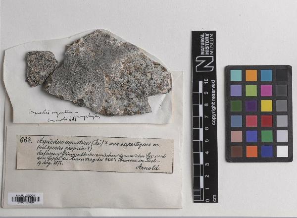 Description: Thallus crustose, episubstratic, continuous to rimose, rarely distinctly areolate, 0.4-0.8 mm thick, smooth, whitish, pale grey or grey-brown, sometimes with a violet tinge, often delimited by a black prothallus, forming well-delimited orbicular patches. Cortex granular-inspersed; medulla white, I-; algal layer not extending below the hypothecium. Apothecia lecanorine-aspicilioid, immersed in the thallus, 0.3-1.5(-2) mm across, usually irregular in outline, with a concave to finally flat, black, epruinose disc and a thin, often indistinct thalline margin. Epithecium greenish to olive-brownish, N+ emerald green; hymenium colourless, 115-140 µm high, I+ blue turning reddish; paraphyses submoniliform, the apical cells to 3.5 µm wide; hypothecium colourless, inspersed with oil droplets. Asci 8-spored, cylindrical-clavate, the thin outer coat K/I+ blue, the wall and apical dome K/I-. Ascospores 1-celled, hyaline, broadly ellipsoid, (15-)17-22(-25) x 10-14(-16) µm. Conidia thread-like, slightly curved, (17-)25-40 x c. 0.5 µm. Photobiont chlorococcoid. Spot tests: cortex and medulla K-, C-, KC-, P-. Chemistry: aspicilin.Note: a boreal-montane to arctic-alpine, perhaps circumpolar, variable lichen found on lime-free but base-rich rocks, often on mica-schist in humid situations (near brooks, melting snow, etc.), with optimum near and above treeline; probably restricted to the Alps in Italy.