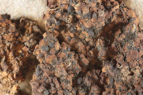 Description: Thallus squamulose, pale to dark brown, becoming greenish when wet, epruinose, the squamules 2-5(-8) mm long and up to 4 mm wide, rounded at tips, slightly concave to weakly convex, smooth, clearly imbricate, the lower surface medium to dark brown. Upper cortex 40-70 µm thick, with a narrow epinecral layer, of rather thin-walled, more or less anticlinally oriented hyphae with ellipsoid to round lumina; algal layer continuous; medulla white, of intricately interwoven hyphae, I-. Apothecia frequent, lecideine to biatorine, sessile, up to 2 mm across, with a dark brown to black, at first flat, then rapidly convex disc and a thin, finally excluded proper margin. Proper exciple annular, pale brown, of thick-walled, strongly conglutinated, radiating hyphae; epithecium brownish, K-, N-; hymenium colourless, 80-100 µm high, I+ blue; paraphyses coherent, sparingly branched and anastomosing, the apical cells slightly swollen; hypothecium pale brown, without crystals of calcium oxalates. Asci 8-spored, elongate-clavate, with a thin, outer amyloid layer and a thickened tholus penetrated by a tube, the sides of which stain K/I+ deep blue, Porpidia-type. Ascospores 1-celled, hyaline, narrowly ellipsoid, thin-walled, (8-)10-14(-16) x (5-)6-8(-9) µm. Pycnidia dark, at first immersed then slightly projecting, mostly marginal, with a dark brown wall and short-celled, intricately branched conidiophores. Conidia pleurogenous, hyaline, narrowly ellipsoid, (3-)4-6 x 1.5-2 µm. Photobiont chlorococcoid. Spot tests: K-, C-, KC-, P-, UV-. Chemistry: without lichen substances. Note: a calcicolous, ecologically and altitudinally wide-ranging species, whose development often starts in fissures of the rock subject to temporary water seepage after rain, with a wide altitudinal range but rather rare above treeline.