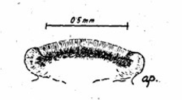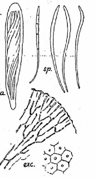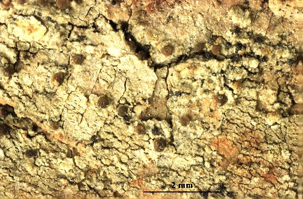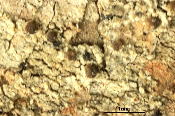 Description: Thallus crustose, endosubstratic or thinly episubstratic, white to pale grey, continuous to rimose, rarely minutely granular. Apothecia lecideine, (0.2-)0.5-0.8(-1) mm across, at first yellowish brown, then brown to brown-black, with a flat to finally convex, epruinose disc, and a usually darker, finally sometimes excluded proper margin. Proper exciple brownish in outer part, colourless or pale yellow within, 60-95 μm thick laterally, 100-125 μm thick at base, of radiating hyphae, usually with a single row of up to 6 μm thick, rounded cells along the outer edge, the pigmented parts K- or K+ yellow; epithecium yellow-brown or olive-brown, K-, N-; hymenium colourless, 45-70(-90) μm high, I+ blue, K/I+ deep blue; paraphyses simple or irregularly forked in upper part, 0.8-1.5 μm thick at mid-level, the apical cells up to 2.5(-4) μm wide; hypothecium colourless or yellow-brown and K+ intensifying yellow in upper part, 20-35 μm high. Asci 8-spored, clavate to cylindrical-clavate, the apical dome K/I+ dark blue with a pale, conical-pointed apical cushion (axial mass), the wall I-, but the thin outer gel I+ blue, Bacidia-type. Ascospores, 3-7-septate, hyaline, acicular. (32-)35-55(-70) x 1.2-2(-2.5) μm. Pycnidia rare, inconspicuous, immersed. Conidia filiform, curved, 9-17 x c. 0.7 μm. Photobiont chlorococcoid, the cells 5-12 μm in diam. Spot tests: thallus K-, C-, KC-, P-, UV-. Chemistry: thallus without lichen substances.