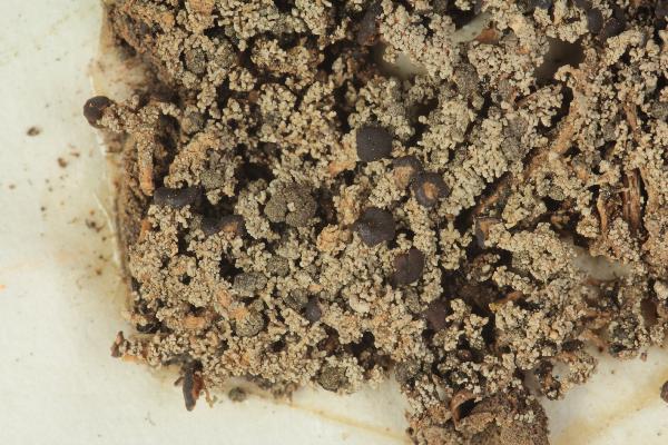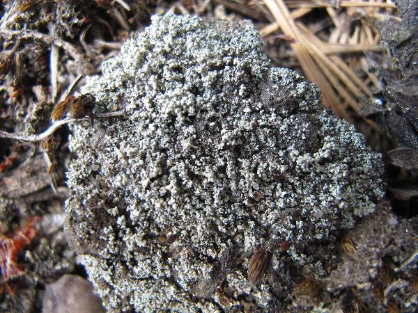 Description: Primary thallus persistent, of granular to incised-elongate phyllocladia with abundant interspersed cephalodia, forming a crust. Pseudopodetia rarely present, with a solid cartilaginous axis of parallel hyphae surrounded by a lax medulla, ascending to erect, terete, up to 1.5(-2.5) cm tall, 0.5-1 mm thick, simple or sparingly branched, tomentose at least in upper parts. Phyllocladia small, wart-like to incised, horizontal, greyish white to beige. Cephalodia abundant, dark reddish brown to blackish brown, with a scabrid surface, 1-1.5 mm across (those on the basal phyllocladia) or 0.2-0.5 mm across (those on the pseudopodetia), containing Stigonema, located between primary thallus granules or at the base of pseudopodetia. Apothecia rare, dark brown, 1-2 mm across, rounded, without a thalline margin, on the basal phyllocladia or terminal on the pseudopodetia. Proper exciple brown in outer part, colourless within; epithecium brown, K-; hymenium colourless; paraphyses simple, 1-1.5 µm thick, the apical cells up to 4 µm wide, with a dark cap; hypothecium colourless. Asci 8-spored, cylindrical-clavate, with a K/I+ blue outer layer and apical dome, and a central, K/I+ darker blue tube, Porpidia-type. Ascospores mainly 3-septate, hyaline, cylindrical-fusiform, 22-40 x 2.5-3 µm. Pycnidia dark, immersed in the basal phyllocladia. Conidia thread-like, straight or slightly curved, 5-6 x c. 0.8 µm. Main photobiont chlorococcoid. Spot tests: K+ yellow, C-, KC- or KC+ violet (reaction often difficult to observe macroscopically, best evident on acetone extract on filter paper!), P+ faintly yellow or more rarely P-, UV+ blue-white. Chemistry: atranorin and variable amounts of lobaric acid. Note: a cool-temperate to boreal-montane, circumpolar lichen found on sandy to gravelly, often disturbed soil in open situations, often associated with Pycnothelia papillaria; probably restricted to the Alps in Italy, with a few dealpine stations in the western upper Padanian Plain (Lomellina). An earlier record from Campania (Nimis 1993: 673), being dubious, is not accepted here