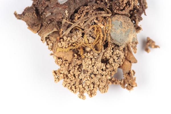 Description: Primary thallus crustose, ephemeral, usually absent in mature individuals, secondary thallus fruticose. Pseudopodetia loosely attached, prostrate to ascending, up to 4(-8) cm tall, 1-2 mm thick, clearly dorsiventral, thickly grey-tomentose especially on lower surface, with a solid cartilaginous axis of parallel hyphae surrounded by a lax medulla. Phyllocladia abundant, granulose to squamulose, ash-grey, mostly rounded and flattened, often overlapping. Cephalodia inconspicuous, more or less spherical, to 0.7 mm across (usually less), embedded in the tomentum of the underside, with Nostoc. Apothecia frequent, mainly located on lateral branches, up to 0.7(-1.2) mm across, with a dark brown to blackish brown, convex disc and an indistinct margin. Proper exciple brown in outer part, colourless within; epithecium brown, K-; hymenium colourless, 45-55 µm high; paraphyses simple, 1.5-1.8 µm thick, the apical cells 3-4 µm wide, with a dark cap; hypothecium colourless. Asci 8-spored, cylindrical-clavate, with a K/I+ blue outer layer and apical dome, and a central, K/I+ darker blue tube, Porpidia-type. Ascospores 3(-6)-septate, hyaline, fusiform, 20-50 x (2.5-)3-4 µm. Pycnidia rare, dark, immersed. Conidia 1-celled, hyaline, straight, 4-5 x c. 0.8 µm. Main photobiont chlorococcoid. Spot tests: K+ yellow, C-, KC-, P+ orange, UV-. Chemistry: atranorin, stictic acid and variable amounts of norstictic acid. Note: a mainly boreal-montane, circumpolar lichen found on mineral soil in open habitats, such as in clearings of Pinus-stands; several Italian records need re-confirmation.
