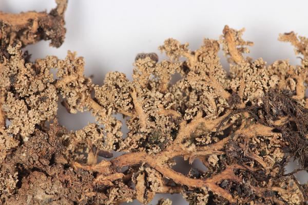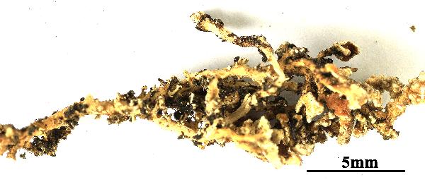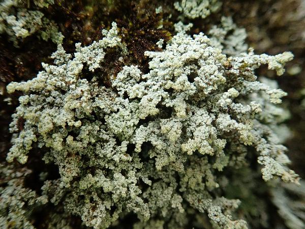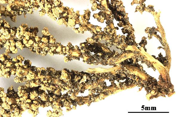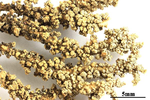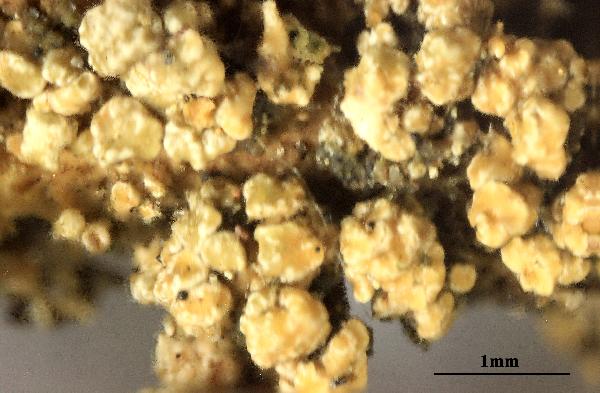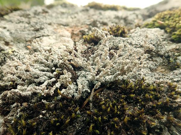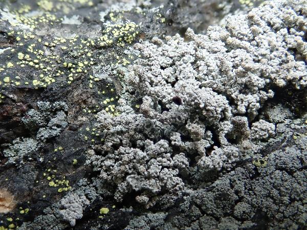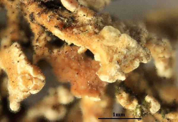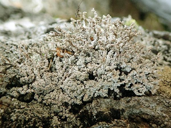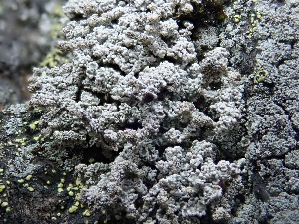 Description: Primary thallus crustose, ephemeral, usually absent in mature individuals, secondary thallus fruticose, forming pillows or extended mats on the rock. Pseudopodetia 1-4(-7) cm tall, firmly attached, erect to decumbent, rigid, lacking tomentum but with a more or less felty surface, whitish or greyish, darker at base, simple or branched in upper part, esorediate, with a solid cartilaginous axis of parallel hyphae surrounded by a lax medulla. Phyllocladia often almost entirely covering the pseudopodetia, small, often verrucose, the largest ones usually peltate, flattened or concave, usually not confluent, at least some of them with a dark olive-coloured central part and paler margins. Cephalodia rare, verruculose, dark olive brown, containing Stigonema. Apothecia rare, 0.5-1 mm across, located on lateral branches, with a dark brown disc. Proper exciple brown in outer part, colourless within; epithecium brown, K-; hymenium colourless; paraphyses mostly simple, 1.5-1.8 µm thick at mid-level, the apical cells up to 4.5 µm wide, with a dark cap; hypothecium colourless. Asci 8-spored, cylindrical-clavate, with a K/I+ blue outer layer and apical dome, and a central, K/I+ darker blue tube, Porpidia-type. Ascospores 3-6-septate, hyaline, fusiform but thicker at one end, 26-38 x 3-3.5 µm. Pycnidia rather rare. Conidia 1-celled, hyaline, straight or curved, 8-12 x 0.6-0.8 µm. Main photobiont chlorococcoid. Spot tests: thallus K+ yellow (rarely K+ red), C-, KC-, P+ orange, UV-. Chemistry: atranorin and variable amounts of stictic and sometimes norstictic acids.Note: on volcanic rocks, exceptionally also on wood; abundant on the Vesuvium and the Etna Volcanoes, but much rarer elsewhere in Italy, due to the scarcity of suitable substrata; most records from the Alps need confirmation.