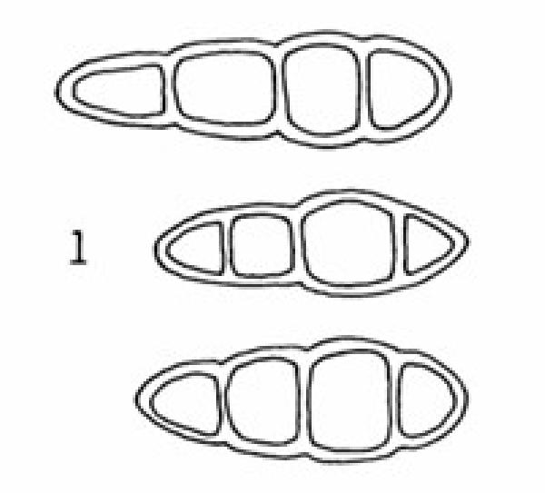 Description: Thallus crustose, largely endosubstratic, whitish or pale grey, very thin. Perithecia black, 0.3-0.45 μm across, largely immersed, the upper part rounded or flattened. Involucrellum brown, confined to the apical part of the exciple; exciple colourless to brownish; paraphysoids mostly simple, thread-like, c. 1 μm thick, longer than the asci, sparingly branched and anastomosing only where adjacent to exciple. Asci 8-spored, cylindrical (slightly enlarged in the middle), bitunicate-fissitunicate, shortly stalked at base, the apex thickened into a tholus, with a narrow ocular chamber. I-. Ascospores 3-septate, hyaline, not constricted at septa, fusiform, (12-)14-19(-24.5) x (3-)4-6.5 μm, with subequal cells, surrounded by a thin perispore. Pycnidia often of two types. Macropycnidia 0.15-0.2 mm across, largely immersed, with an involucrellum in the upper third; macroconidia 3-septate, subapically inserted on the conidiogenous cell, not or scarcely constricted at septa, cylindrical or subcylindrical, each end with a gelatinous appendage, 13-18(-20) x 2.5-4(-6) μm; micropycnidia similar, but 0.05-0.1 mm across; microconidia simiple, shortly cylindrical, 3-4 x 1-1.5 μm. Photobiont trentepohlioid. Spot tests: thallus K-, C-, KC-, P-. Chemistry: thallus without lichen substances.Note: a mainly temperate species found on the smooth bark of deciduous trees, e.g. Fraxinus, Juglans, Tilia.