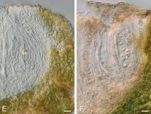 exciple pale, paraphyses lax (Schultz 07226, epitype). F. Ascus with simple ascospores in small hymenial chamber surrounded by robust excipular hyphae,