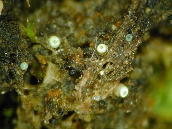 Description: Thallus doubtfully lichenized, reduced to bright yellow-pruinose fertile warts. Ascocarps globose, 0.15-0.4 mm across, up to 0.2 mm high, perithecioid when young, later with a minute, expanded disc, immersed in the warts. Exciple 40-70 μm thick at apex, 30-50 μm thick in lower part, colourless in section; hymenial gel I+ red, K/I+ blue; paraphyses mostly simple, rarely slightly branched and anastomosing, slender, longer than the asci. Asci many-spored, spindle-shaped, tapering to apex, the wall I+ pale blue in upper part, the apex thickened into a tholus with a I+ blue ring-structure within. Ascospores 1-celled, hyaline, oblong 6-8.5(-11) x 4-5 μm. Photobiont absent. Spot tests: K-, C-, KC-, P-. Chemistry: yellow pruina on the ascocarps with pulvinic acid derivatives.Note: a doubtfully lichenised species found on humus-rich soil, mosses, rotten wood and other lichens in upland areas. The only Italian record, referring to a sample growing on Squamarina cartilaginea, is dubious.