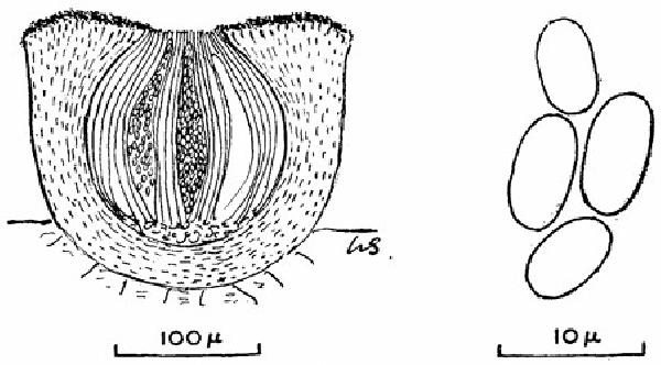 Description: Thallus not lichenized, reduced to apically yellow-pruinose fertile warts. Ascocarps globose, 0.15-0.4 mm across, up to 0.2 mm high, perithecioid when young, later with a minute, expanded disc, immersed in the warts. Exciple 40-70 μm thick at apex, 30-50 μm thick in lower part, colourless in section; hymenial gel I+ red, K/I+ blue; paraphyses mostly simple, rarely slightly branched and anastomosing, slender, longer than the asci, the apices forming a kind of epithecium. Asci >100-spored, flask-shaped, tapering to apex, the wall I+ pale blue in upper part, the apex thickened into a tholus with a I+ blue ring-structure within. Ascospores 1-celled, hyaline, oblong, 6-8.5(-11) x 4-5 μm, often guttulate. Photobiont absent. Spot tests: K-, C-, KC-, P-. Chemistry: yellow pruina on the ascocarps with pulvinic acid derivatives.Note: a doubtfully lichenised species found on humus-rich soil, mosses, rotten wood and other lichens in upland areas. The only Italian record, referring to a sample growing on Squamarina cartilaginea, is dubious.