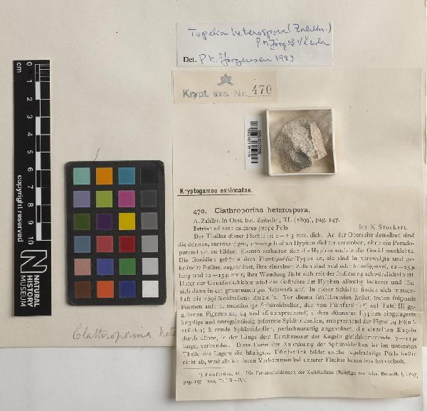 Beih. Nova Hedwigia, 79: 505, 1984. Basionym: Clathroporina heterospora Zahlbr. - Österr. bot. Z., 49: 247, 1899.