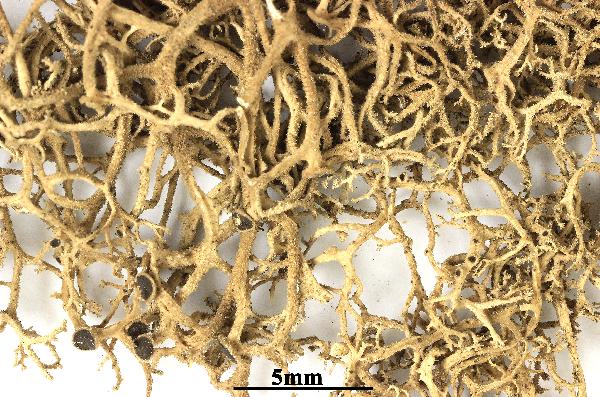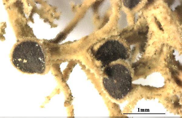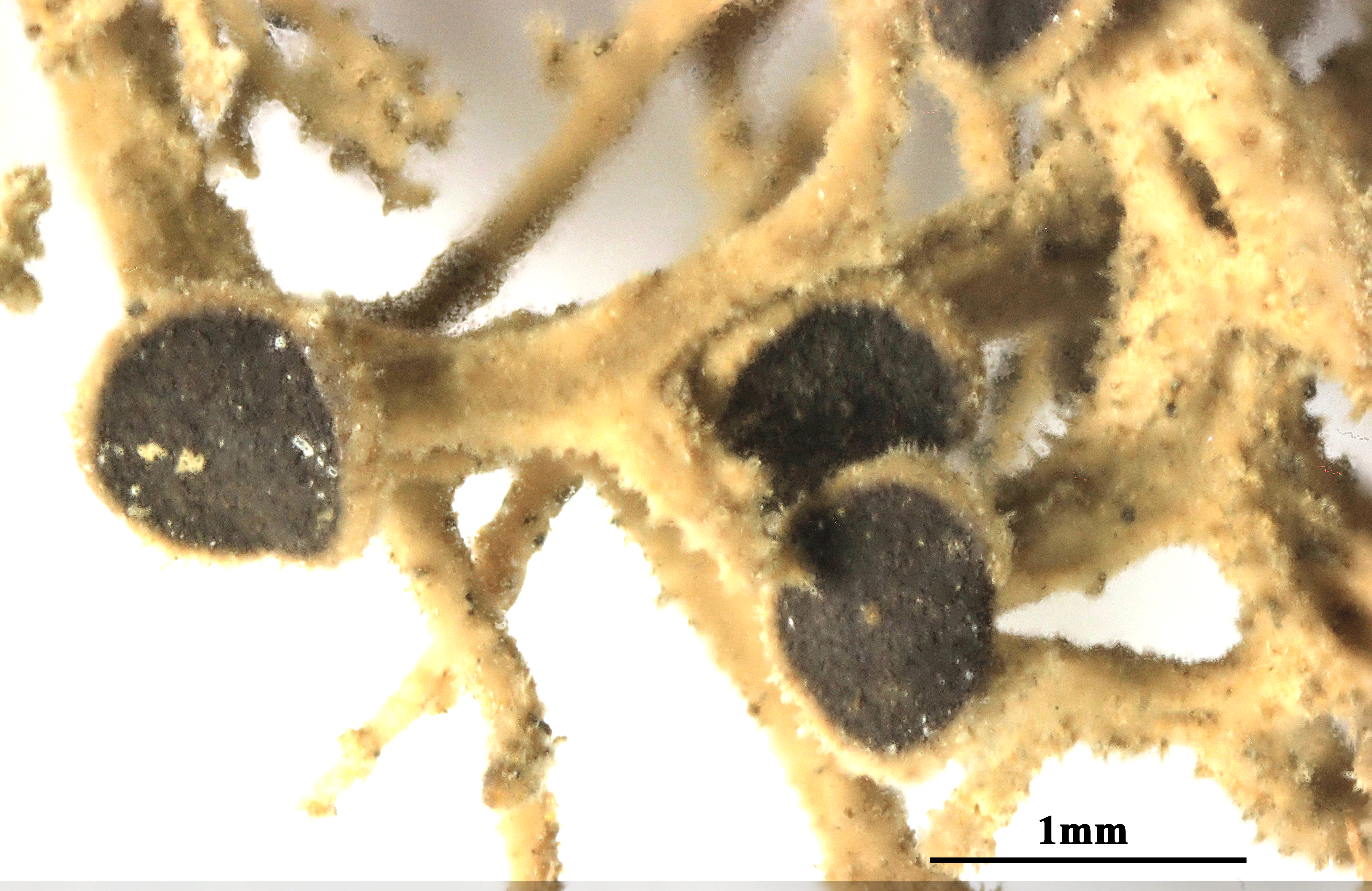 Description: Thallus fruticose, shrubby to subpendent, up to 5 cm long, grey-brown to greenish brown, sparingly to richly branched, the branches to 1.2 mm thick, becoming progressively thinner towards the apices, subterete to flattened (especially in basal parts), densely and finely hairy to totally glabrous, sometimes diffusely blastidiate (especially in sterile specimens) and/or with spiniform papillae. Cortex 60-200 µm thick, of conglutinated, thick-walled, mostly longitudinally oriented hyphae, sometimes with an amorphous layer which gives rise to short lateral hyphae reaching the surface; medulla lax to almost absent, of loosely interwoven hyphae, often with strands of conglutinated, longitudinally oriented hyphae below the cortex. Apothecia lecanorine, most frequent in non-blastidiate specimens, to 1.2 mm across, mostly lateral, with a brown-black to black disc and a smooth thalline margin. Asci 8-spored, clavate, very thin-walled, with a K/I+ blue, tall tholus penetrated by a faintly amyloid apical cushion, the wall K/I-, surrounded by a K/I+ blue outer layer, Lecanora-type. Ascospores 1(-2)-septate, brown, ellipsoid, 20-26(-30) x 10-15 µm, the septum c. 6.5 µm thick, intermediate between the Orcularia and Physconia-types, the wall ornamented. Pycnidia rather common, immersed, with a dark brown ostiolum. Conidia hyaline, fusiform to bacilliform, 3.5-4.5(-5) x c. 1 µm. Photobiont chlorococcoid. Spot tests: cortex and medulla K-, C-, KC-, P-, UV-. Chemistry: without lichen substances.Note: on a wide variety of substrata, most frequent on branches of littoral shrubs but also on rocks, and, but only in a few very warm-humid areas, even on mortar (e.g. it is still abundant in the village of Erice in Sicily); much more widespread in the past, but presently restricted to a few, localised stations with natural vegetation, especially sand dunes, mostly along the Tyrrhenian coast, in sites with a high persistence of fog, or with frequent humid maritime winds alternating with dry periods. It is included in the Italian red list of epiphytic lichens under the “Least Concern” category (Nascimbene & al. 2013c).