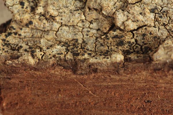 Description: Thallus crustose, mostly episubstratic, grey-green, grey-brown or grey-white, granular-verrucose. Apothecia lecideine, (0.2-)0.3-0.8(-1) mm across, sessile an constricted at base, dark purple-brown to black, with a flat to slightly convex disc and a thin, persistent, often slightly paler proper margin. Proper exciple hyphal in construction, with globose outer cells, dark red-brown, K+ purple, the outermost part sometimes colourless; epithecium colourless to reddish, K-; hymenium colourless or pale red in upper part, 35-50 μm high, I+ blue; paraphyses 1.5-2(-2.5) μm thick at mid-level, simple or rarely forked in upper part, the apical cells up to c. 3 μm wide; hypothecium dark red-brown, K+ purple. Asci 8-spored, clavate, the apical dome K/I+ dark blue with a pale, conical-pointed apical cushion (axial mass), the wall I-, but the thin outer gel I+ blue, Bacidia-type. Ascospores (1-)3(-5)-septate, hyaline, elongate-bacilliform to cylindrical, 15-25(-27) x 2-3 μm, fasciculate in the asci. Pycnidia small, semi-immersed, with thin, red-brown, K+ purple walls. Conidia cylindrical-ellipsoid, 0-1-septate, 5-9 x 2-2.5 μm. Photobiont chlorococcoid, the cells globose, 5-12(-14) μm in diam. Spot tests: thallus K-, C-, KC-, P-, UV-. Chemistry: thallus without lichen substances.Note: a temperate species found on base-rich bark, especially of Ulmus, near wounds of the trunk, more rarely on plant debris and terricolous mosses, certainly declining in Italy. It is included in the Italian red list of epiphytic lichens as “Vulnerable” (Nascimbene & al. 2013c).