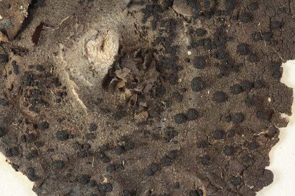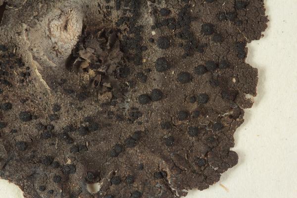 Description: Thallus foliose-umbilicate, heteromerous, dorsiventral, monophyllous, thin and fragile, strongly adpressed, orbicular or elliptic in outline, 2-5(-8) cm diam., with lacerate, shallowly incised, slightly up-turned margins, attached by a central holdfast. Upper surface dark brown to black, dull, with a reticulate pattern of ridges over the umbilicus, fading to vermiform ridges toward the margins, the central umbo raised and often white-pruinose. Lower surface pale brown, darker toward margins, even or with shallow depression around umbilicus, usually erhizinate or rarely with a few simple or sparsely branched rhizinomorphs; thalloconidia absent. Upper cortex 8-16 µm thick: medulla white, loose; lower cortex paraplectenchymatous, 14-24 µm thick. Apothecia rather rare, black, gyrodisc, sessile, to 1.5 mm across. Epithecium brown-black; hymenium colourless; paraphyses simple or sparingly branched, the terminal cells hardly swollen; hypothecium dark. Asci 8-spored, clavate, thick-walled, with an amyloid apical dome, Umbilicaria-type. Ascospores 1-celled hyaline, ovoid, (10-)12-15(-17) x (3.5-)5-7.5 µm. Photobiont chlorococcoid. Spot tests: medulla K- or K+ yellow turning red, C+ red, KC+ red, P- or P+ faintly yellow. Chemistry: medulla with variable amounts of norstictic acid, plus gyrophoric and lecanoric acids.Note: a mainly arctic-alpine, circumpolar lichen found on siliceous rocks, often on small boulders, ecologically similar to U. cylindrica, but with a narrower range, with optimum in colder and less continental areas above treeline.