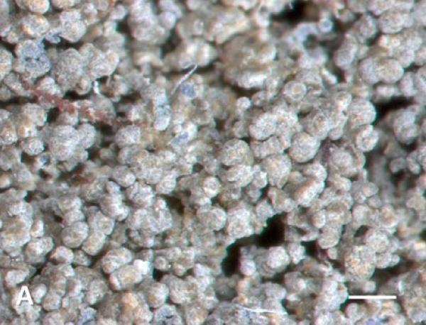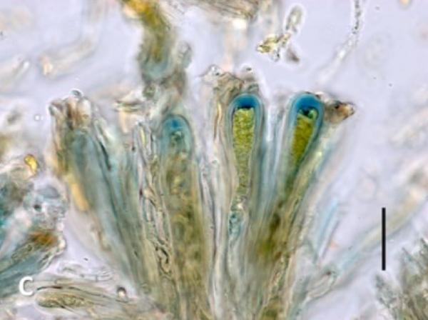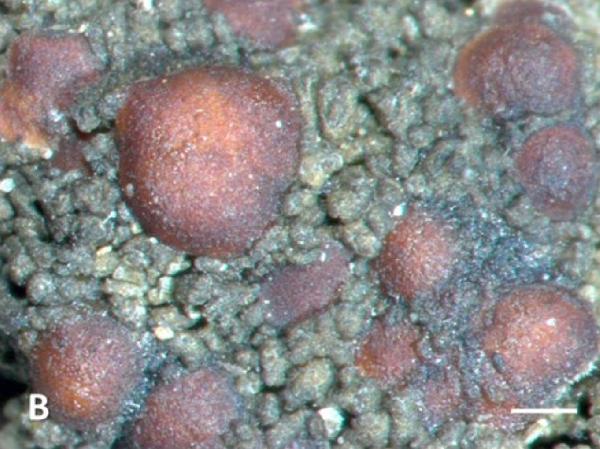 Description: Thallus crustose, heteromerous, 100-150(-200) μm thick, dark grey, isidiate, forming up to 5 cm wide, irregular patches, sometimes delimited by an inconspicuous, blue-black prothallus. Upper cortex of 2-3 layers of thick-walled cells; medulla white, loose, gradually merging into rhizohyphae; lower cortex absent. Apothecia lecanorine, to 2 mm across, often clustered, with a brown, flat to finally convex disc and a granular thalline margin. Proper exciple paraplectenchymatous, up to 40 μm wide; epithecium brownish; hymenium pale brown, 100-120 μm high, I+ blue-green turning reddish; paraphyses simple, c. 2 μm thick, the apical cells clavate; hypothecium colourless to brownish, up to 150 μm high. Asci 8-spored, clavate to subcylindrical, with a thin densely amyloid layer capping the endoascus and an amyloid exoascus, but no other densely amyloid internal structures. Ascospores 1-celled, hyaline, ellipsoid, 15-25(-30) x 6-8 μm, smooth-walled, without a perispore, often guttulate. Photobiont cyanobacterial (Nostoc, the cells in clusters). Spot tests: cortex and medulla K-, C-, KC-, P-, UV-. Chemistry: without lichen substances. Note: a recently-described Macaronesian-Atlantic lichen extending as far north as Scotland and western Scandinavia, with a single disjunct station in Liguria (Varazze).