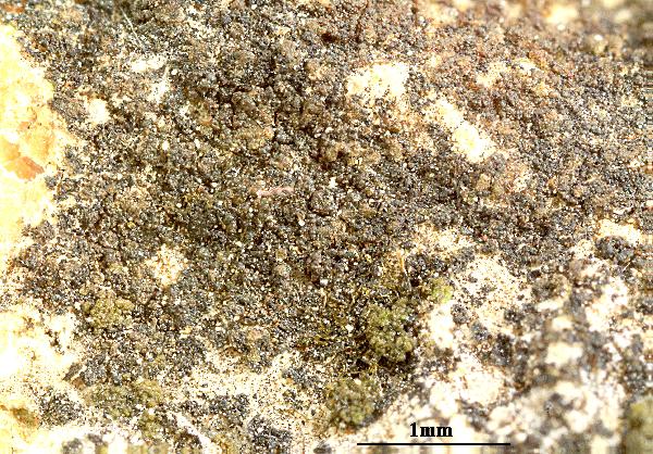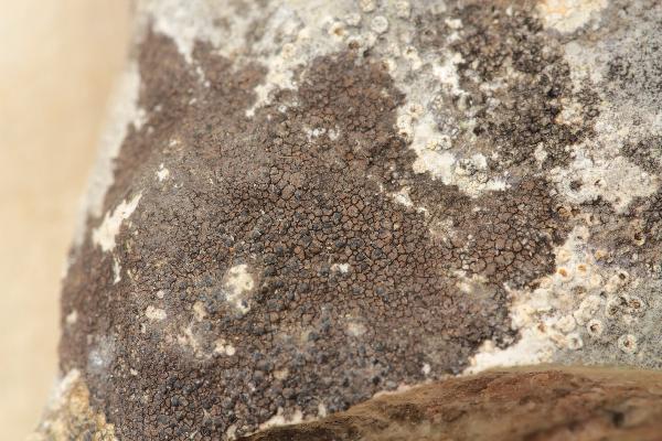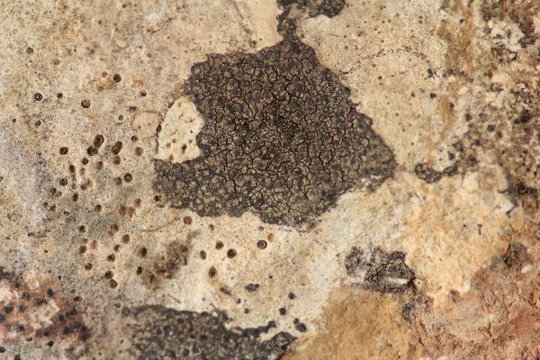 Description: Thallus crustose, episubstratic, cracked-areolate, well-delimited, dark olive-green, dark brown or blackish brown, sometimes almost black, epruinose, 0.1-1.3 mm thick, the areoles 0.2-0.8(-1) mm wide, smooth, flat to slightly convex, often subdivided into smaller units by black lines, sometimes indistinctly blastidiate at margin. Cortex 10-25 µm thick,paraplectenchymatous, of 4-6 µm wide cells, the uppermost ones brown, overlain by a thin epinecral layer; algal layer often interrupted by black columns arising from the medullary basal layer; medulla with a well-developed, carbonaceous black basal layer which occupies 1/3-2/3 of thallus thickness. Perithecia black, 50-70/cm², 1/3 to fully immersed in the areoles, the visible part 0.2-0.25(-0.3) mm across. Involucrellum appressed to exciple, up to 50 µm thick in upper part, extending to base-level and merging with the black basal layer; exciple subglobose, 0.2-0.3 mm across, the wall 15-20 μm thick, black; hamathecium of mostly simple, 25-40 µm long periphysoids, interascal filaments absent; hymenial gel hemiamyloid, I+ red (I+ blue at very low concentrations of I), K/I+ blue. Asci 8-spored, clavate, I-, fissitunicate, the wall thickened above, with an ocular chamber, dehiscent by extrusion of an endotunica to form a delicate rostrum, Verrucaria-type. Ascospores 1-celled, hyaline, ellipsoid, 17-27(-30) x 8-12(-14) µm. Photobiont chlorococcoid. Spot tests: K-, C-, KC-, P-, UV-. Chemistry: without lichen substances.Note: a subcosmopolitan species, one of the most common saxicolous lichens throughout Italy, found both in urban and natural habitats, with a very wide ecological tolerance; several morphs from natural habitats, however, well deserve further study.