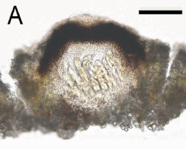 Cross-section of a perithecium of Verrucaria submersella (syntype BM). Scale bar: 50 μm