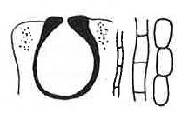 Description: Thallus crustose, thinly episubstratic, brown, finely rimose, forming up to 1 cm wide patches. Photobiont layer plus medulla c. 0.14 mm thick. Perithecia black, 0.2-0.3 mm across, immersed in the centre of the areoles but slightly projecting with the uppermost, depressed part. Involucrellum absent or hardly distingusigable from the apically strongly thickened part of exciple; exciple wall dark reddish brown throughout; hamathecium of periphysoids, interascal filaments absent; hymenial gel hemiamyloid, I+ red (I+ blue at very low concentrations of I), K/I+ blue. Asci 8-spored, clavate, I-, fissitunicate, the wall thickened above, with an ocular chamber, dehiscent by extrusion of an endotunica to form a delicate rostrum, Verrucaria-type. Ascospores 1-celled, hyaline, oblong-ellipsoid, 18-20 x 7-8 µm. Photobiont chlorococcoid. Spot tests: K-, C-, KC-, P-, UV-. Chemistry: without lichen substances.Note: a very poorly known but apparently widespread species of calcareous rocks in upland areas but usually below the alpine belt, reported from the Eastern Alps and Liguria, which badly needs further study. For further details see Breuss (2008).