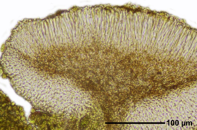 Description: Thallus crustose, finely granular, entirely consisting of 20-40 µm wide, green goniocysts that may or may not form coralline structures. Apothecia biatorine, 0.3-0.7(-1.3) mm across, with a white-grey to grey-brown disc, often with a slight violet hue, and a paler, raised, sometimes white-pruinose proper margin. Proper exciple without crystals, the rim colourless to pale brown, the hyphae towards the outer part with ellipsoidal lumina, 3-7 x 1.5-5 μm; epithecium scarcely differentiated from the hymenium; hymenium colourless or pale brown in upper part, up to 50 µm high; paraphyses 1-1.5(-2) µm thick at mid-level, the apical cells clavate to slightly thickened, up to 4 µm wide; hypothecium and adjacent exciple dark brown to red-brown K+ dark brown (Arnoldiana-brown pigment). Asci 8-spored, clavate to cylindrical-clavate, the apical dome K/I+ dark blue with a pale, conical-pointed apical cushion (axial mass) never penetrating through the entire d-layer, the wall K/I-, but the thin outer gel K/I+ blue, Bacidia-type. Ascospores 1-3(-7)-septate, hyaline, acicular, straight to curved, (19-)24-48 x 0.9-2 µm. Pycnidia white, immersed or slightly projecting, abundant or rare, 0.1-0.2 mm diam. Conidia thread-like, arched or curved, sometimes almost straight, without any hook at apex, 0-3(-5)-septate, 25-45 x 1-1.5 μm. Photobiont chlorococcoid, the cells 5-12 µm wide. Spot tests: thallus K-, C-, KC-, P-, UV-. Chemistry: thallus without lichen substances; Arnoldiana-brown pigment in apothecia.Note: a mild-temperate lichen found on more or less calciferous rocks in sheltered situations, especially in open woodlands; often sterile, and much overlooked. Some epiphytic records could refer to B. modesta.